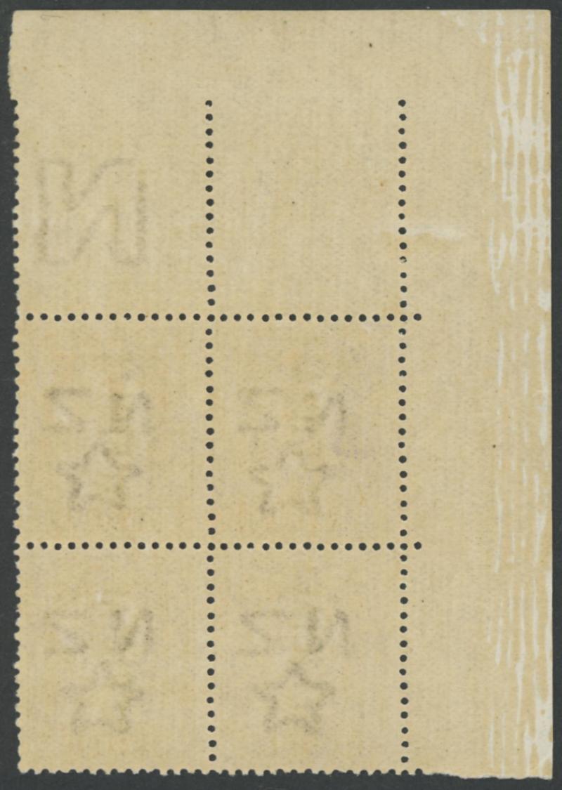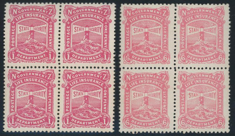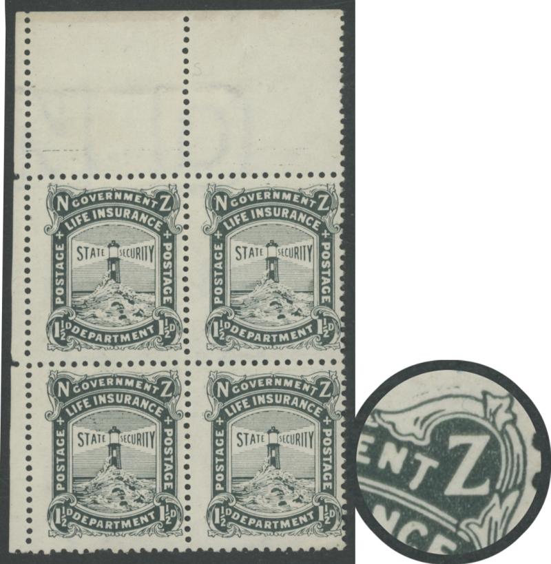 LIFE INSURANCE: 1913-37 Lighthouse NZ/Star 'Single' Watermark 1½d black SG L26 block of 4 from the upper-left corner of the sheet