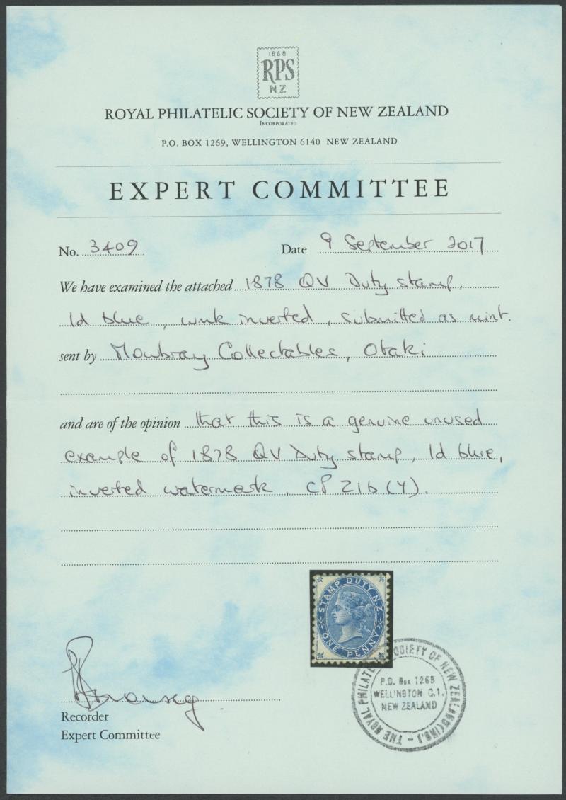 Z1b(Y)), a couple of very minor aging marks, unused, unpriced unused by Gibbons & Campbell Patterson. Cat £250 (NZ$400) for used). RPSNZ Certificate (2017) states "genuine unused ... inverted watermark". (Image1) (Image2)