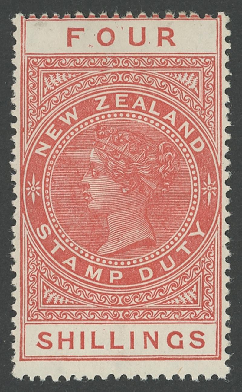 POSTAL FISCALS: 1906 QV Tall Stamp Duty Cowan Paper NZ/Star Single Watermark Perf 14 4/- orange-red SG F80, very lightly mounted,