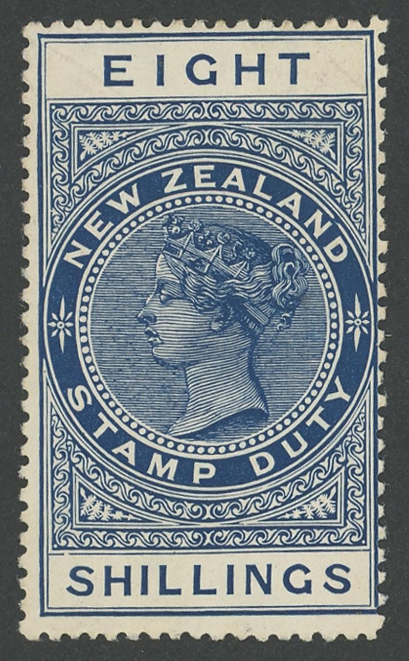 POSTAL FISCALS: 1906 QV Tall Stamp Duty Cowan Paper NZ/Star Single Watermark Perf 14 8/- deep blue SG F85, well-centred, small