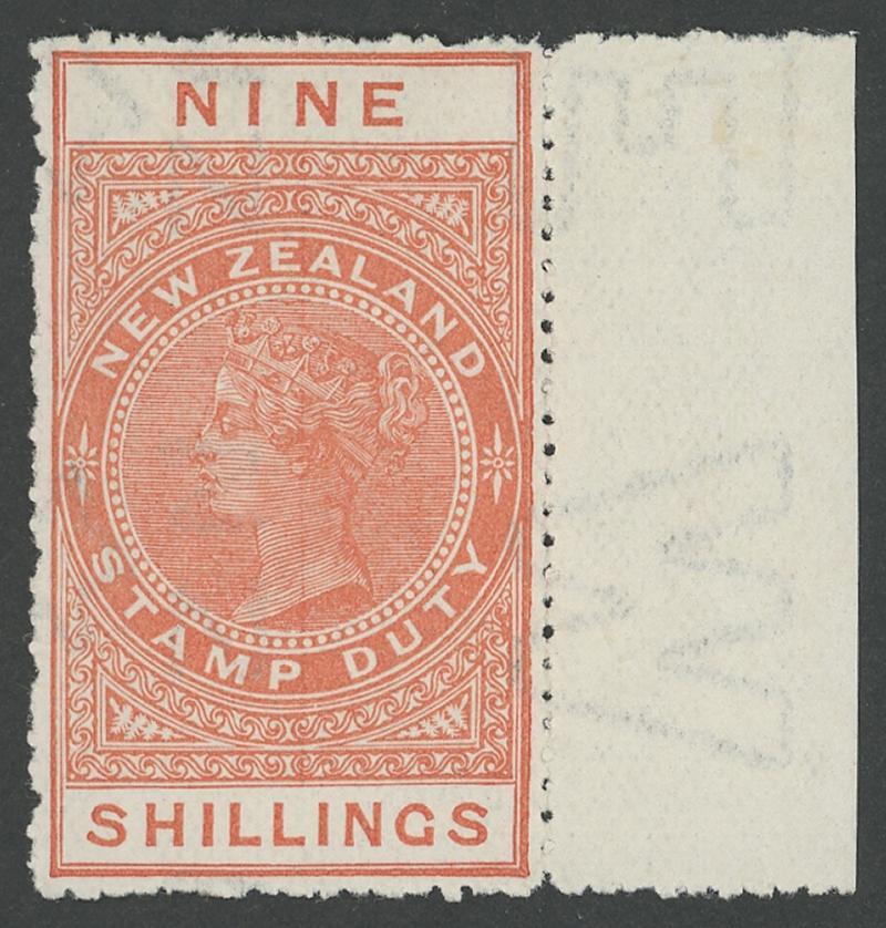 POSTAL FISCALS: 1906 QV Tall Stamp Duty Cowan Paper NZ/Star Single Watermark Perf 14 9/- orange SG F86 marginal example from the