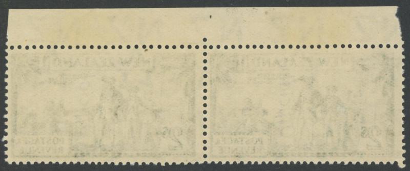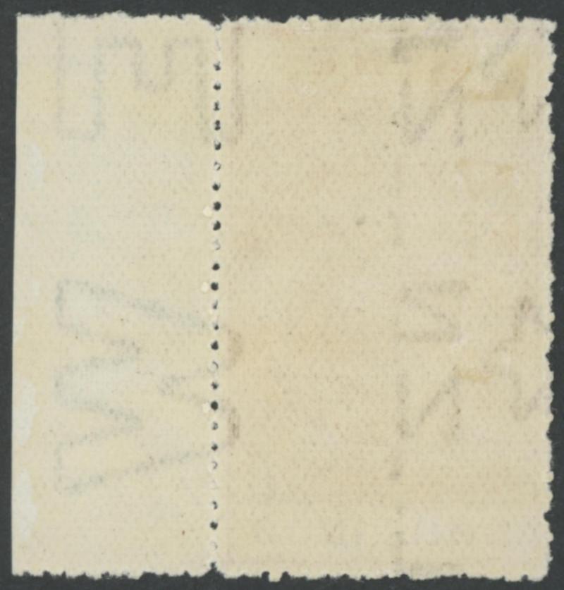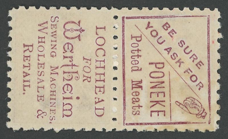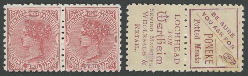 Adverts in Brown-Purple (Third Setting) SG 226f horizontal pair for Poneke Potted Meats and for Wertheim Sewing Machines, wayward centring, well above-average perfs, small hinge remainder/gum disturbance, Cat £750+ for singles. Ex SP Riddell; sold in