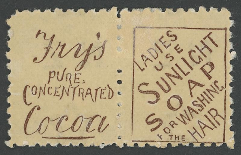 yellow-orange Adverts in Sepia (Second Setting) SG 221e horizontal pair for Sunlight Soap 'Ladies use ...' and for Fry's Cocoa, characteristic uneven perfs, small hinge remainder, Cat £400+ for singles. Ex Sir Gawaine Baillie (2006): sold for £161. (Image1) (Image2)
