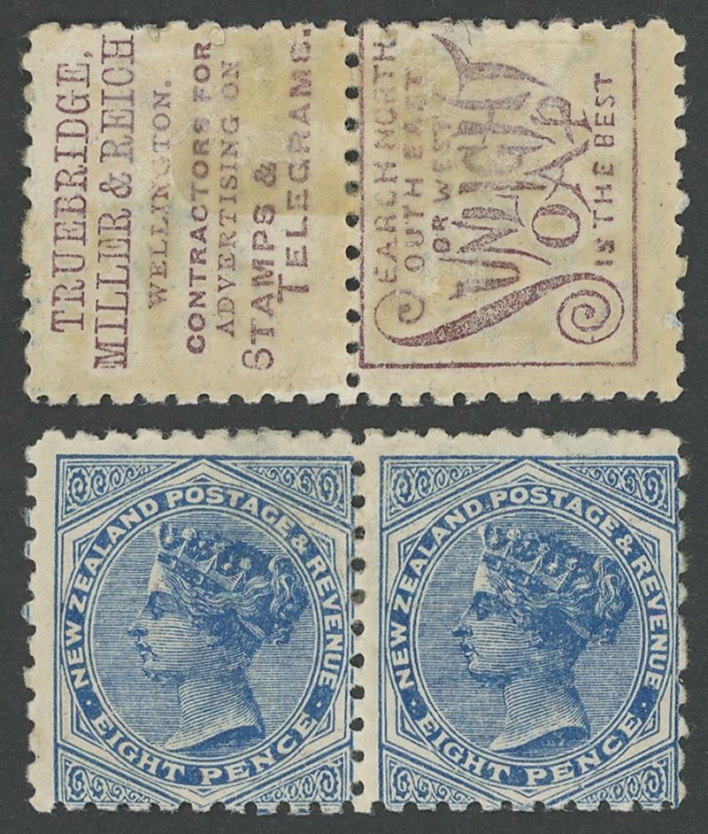 ADVERTISING STAMPS ('ADSONS'): 1882-1900 QV Second Sidefaces Vertical Mesh Paper NZ/Star Watermark Type 12b Perf 10 8d blue Adverts