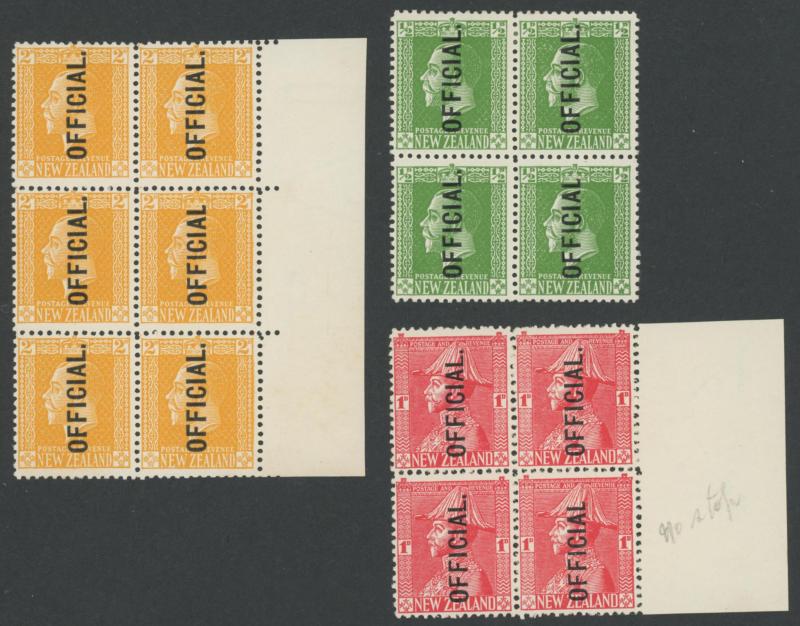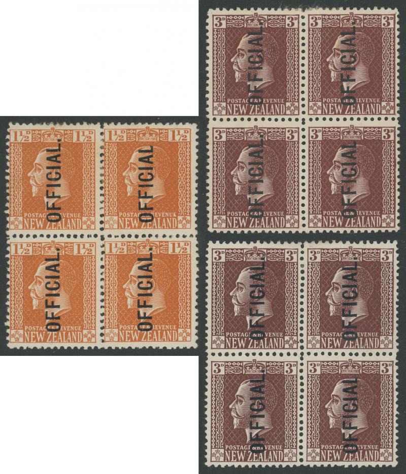 1½d orange-brown Perf 14, 2d yellow, 3d chocolate, and 3d chocolate Perf 14 plus KGV Admiral 1d rose-carmine blocks of 4 (2d block of 6) each including one unit with No Stop after 'OFFICIAL' SG O96ba, O97a, O98a, O99a, O99ba & O111a, generally