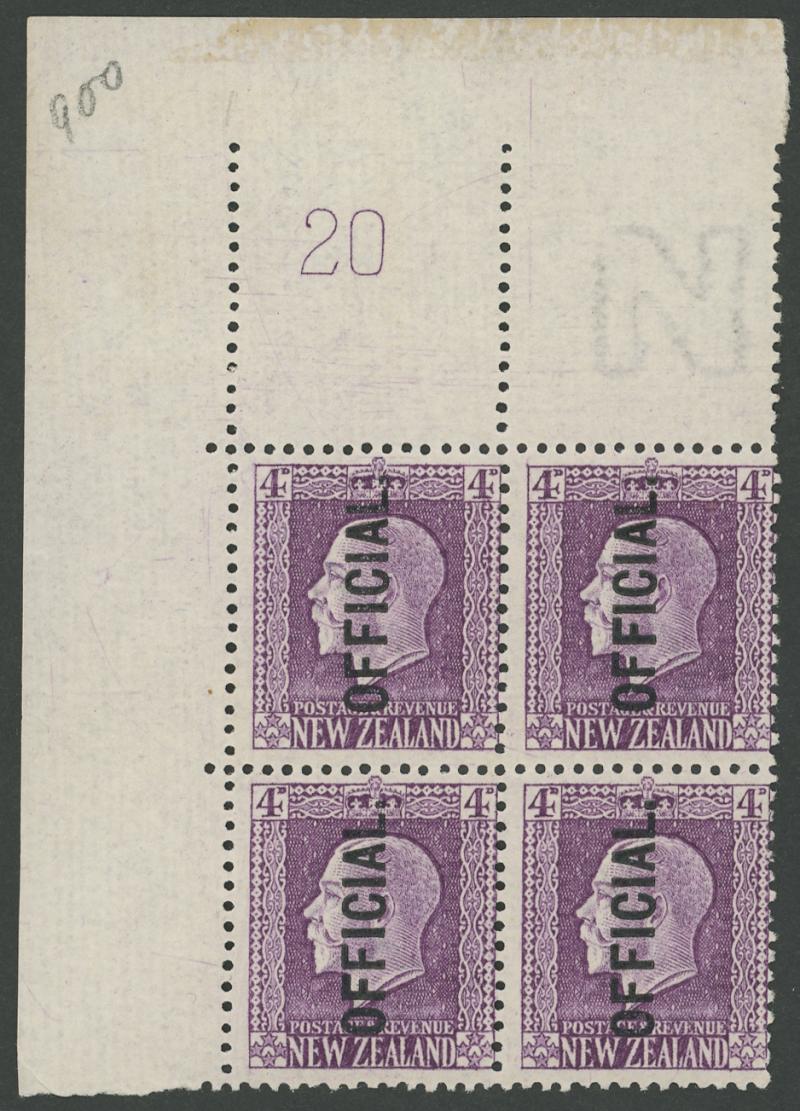 block of 4 from the upper-left corner of the sheet with Plate Number '20' at top CP KO5d([4], very fine, unmounted, Cat NZ$1000+ for mounted. Ex George Branam: sold in 2022 for NZ$675. (Image1) (Image2)