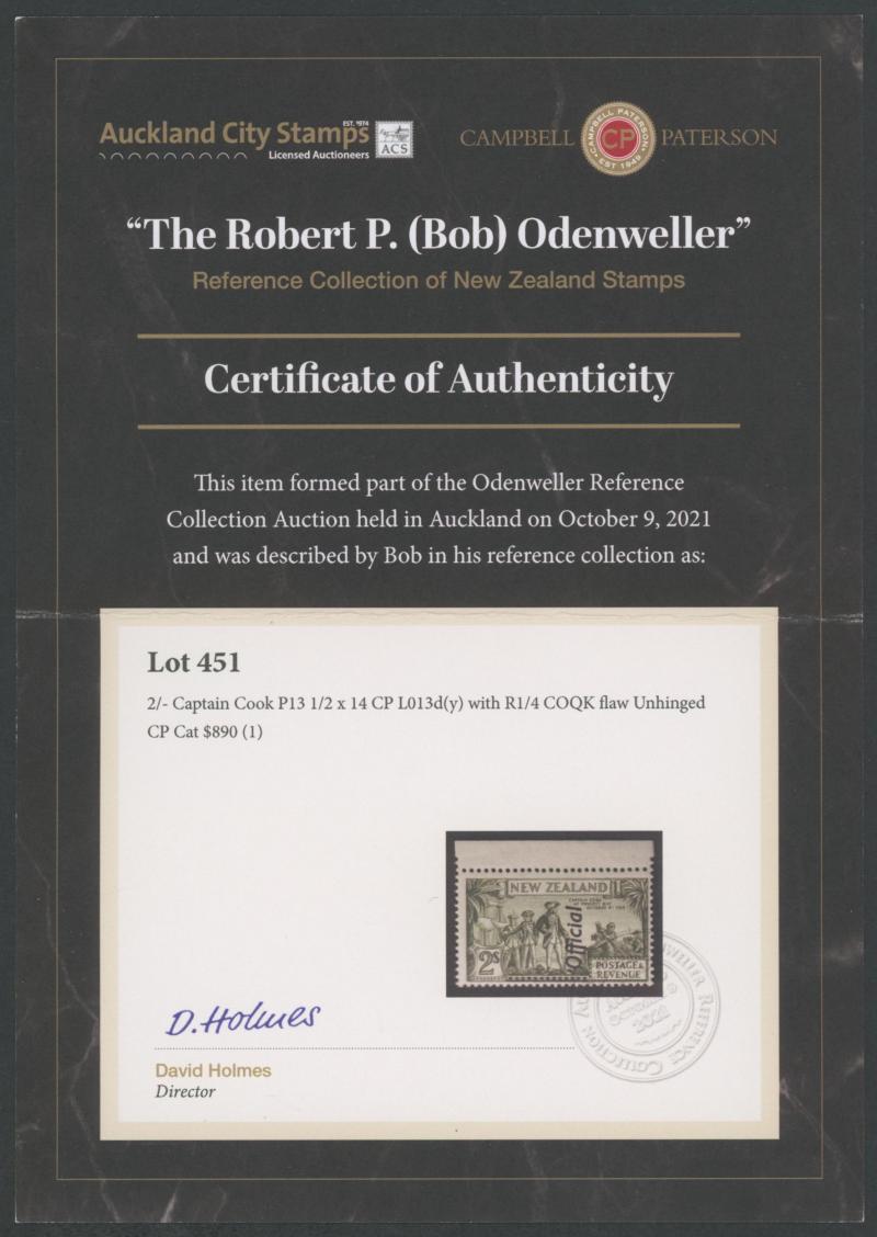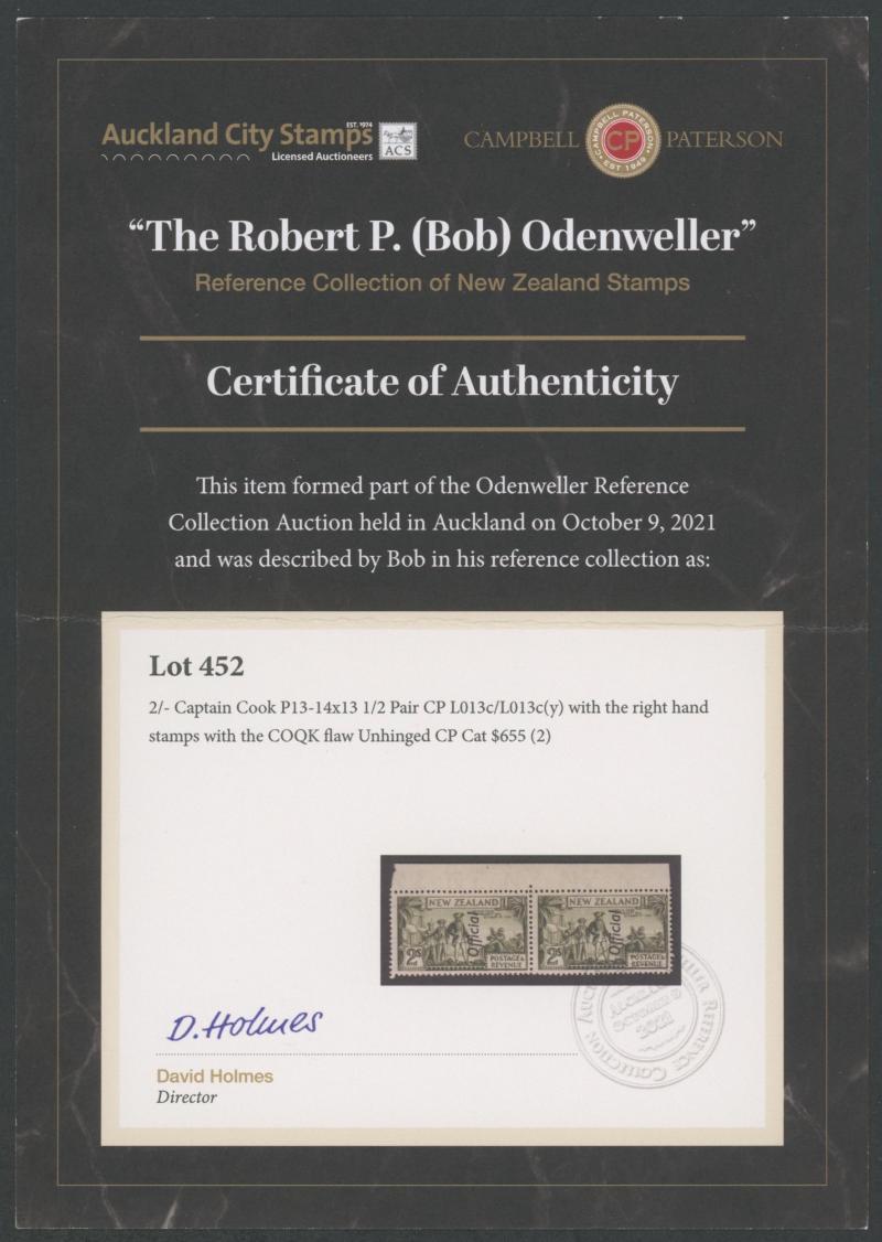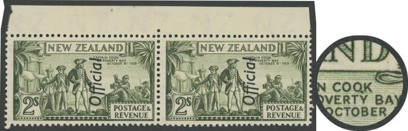 the top of the sheet, the right-hand unit with 'COQK' for 'COOK' SG O132a, lightly mounted in the margin only, the stamps unmounted, Cat £370+ for singles. Ex Robert Odenweller with his certificate. (Image1) (Image2)