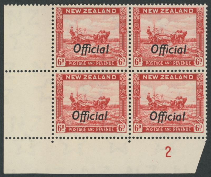 OFFICIAL STAMPS: 1936-61 'Official' Overprint on Pictorials NZ/Star Multiple Watermark Perf 14½x14 6d Harvester SG O127 block of 4