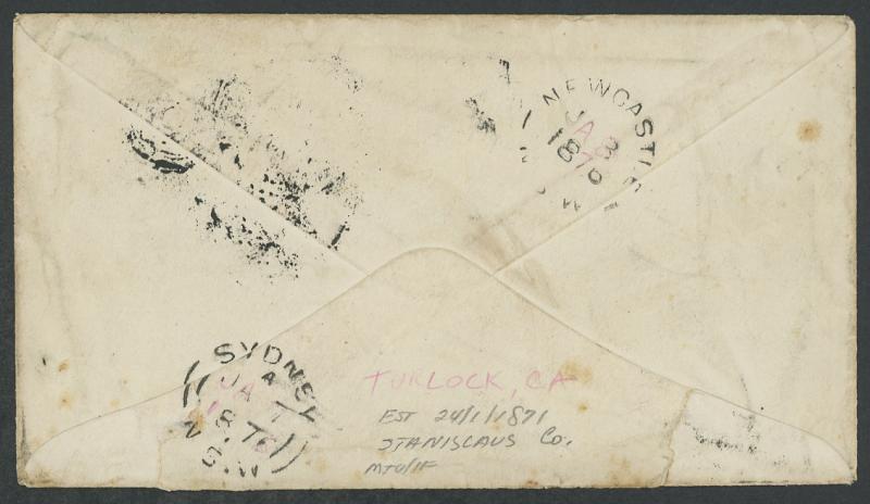 'TURLOCK/CAL' (cds below), assessed as overweight with 'INSUFFICIENTLY/PREPAID' handstamp & superlative strike of the '12' handstamp of San Francisco, Sydney transit of JA7/1876 & Newcastle arrival of the next day, minor blemishes. Ex Dale Forster,