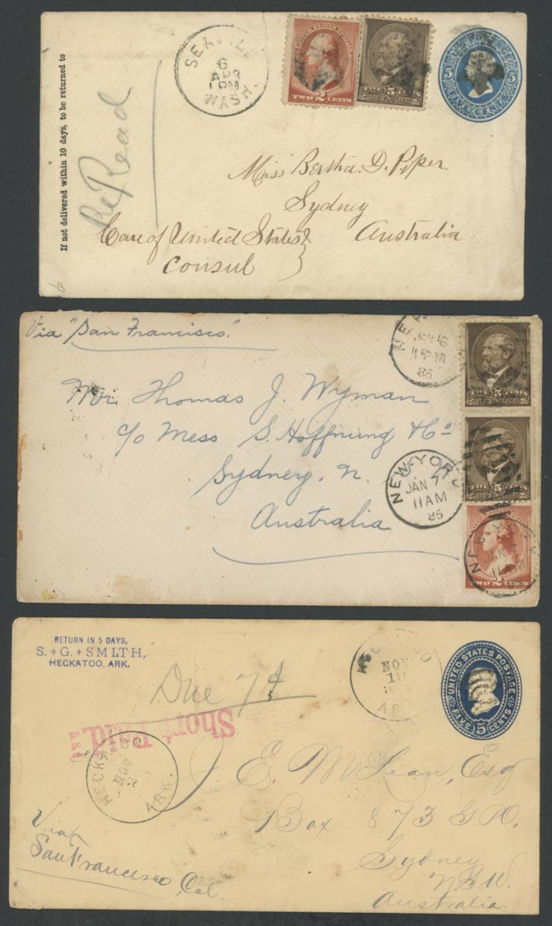 POSTAL HISTORY: 1885-88 Trans-Pacific mail to New South Wales at the 12c Treaty Rate comprising 1) 5c Envelope uprated with 2c