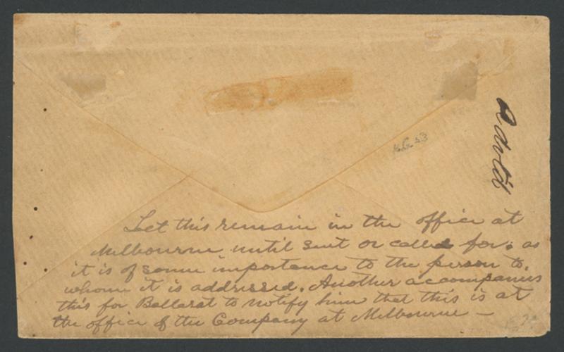 postal markings, extensive instructions added on the face "...now at or near Ballarat...it may be...months before he will call for this mail" and on the reverse "Let this remain in the office at Melbourne until sent or called for..." and in another