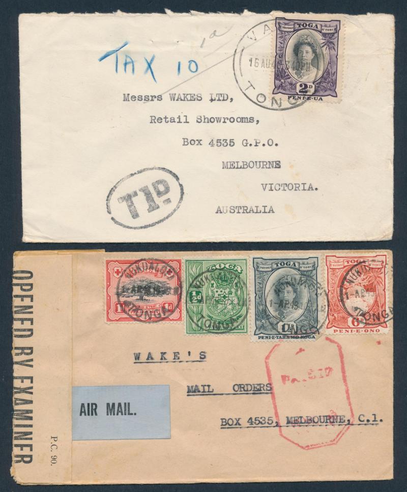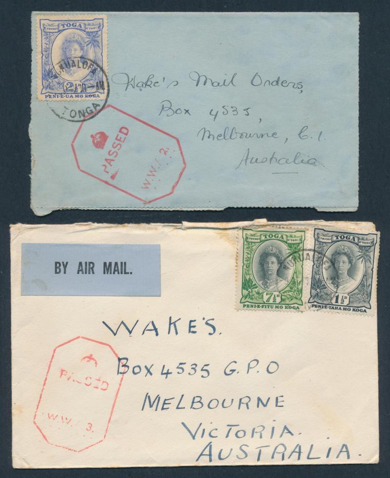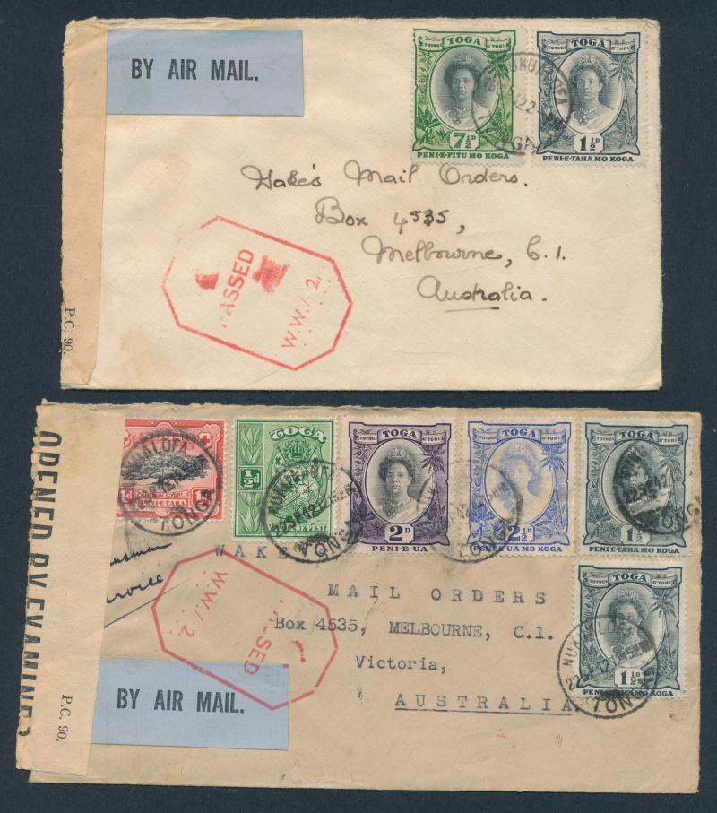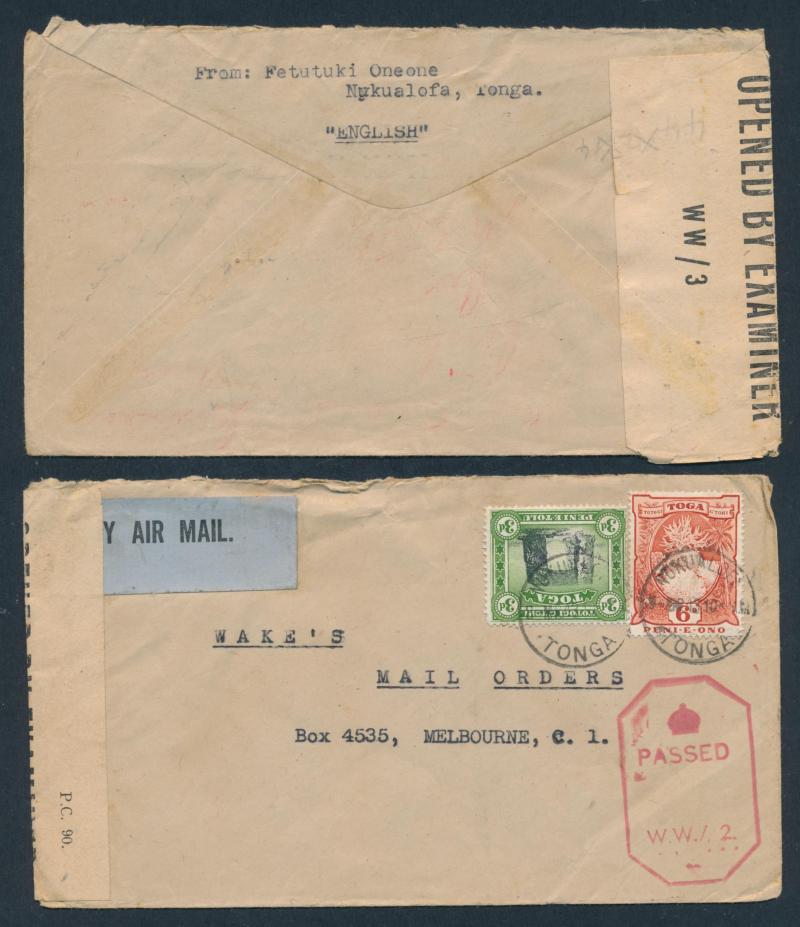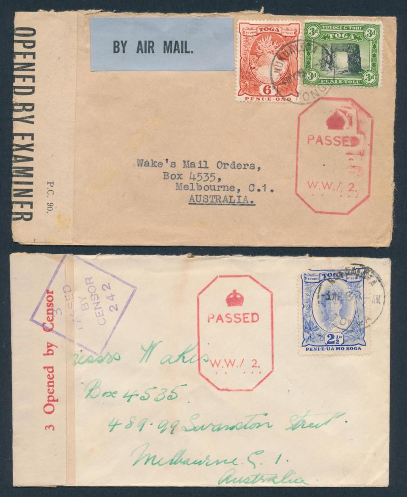 with rare printed black/brown label or 'OPENED BY EXAMINER/WW 2' labels x5 (one folded to the front) or similar '.../WW 3' labels x3 also with octagonal '[crown]/PASSED/WW 2' or '.../WW 3' cachets in rosine, one from 'VAVAU' with "TAX 10" in blue