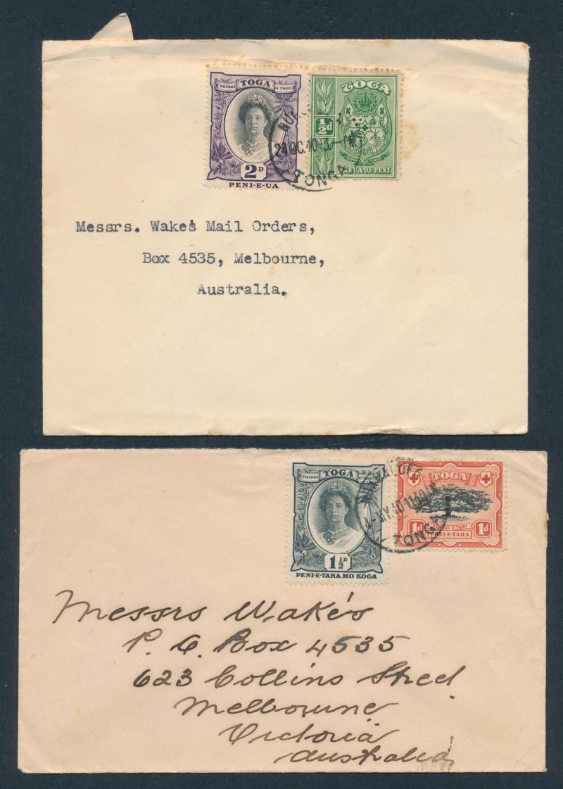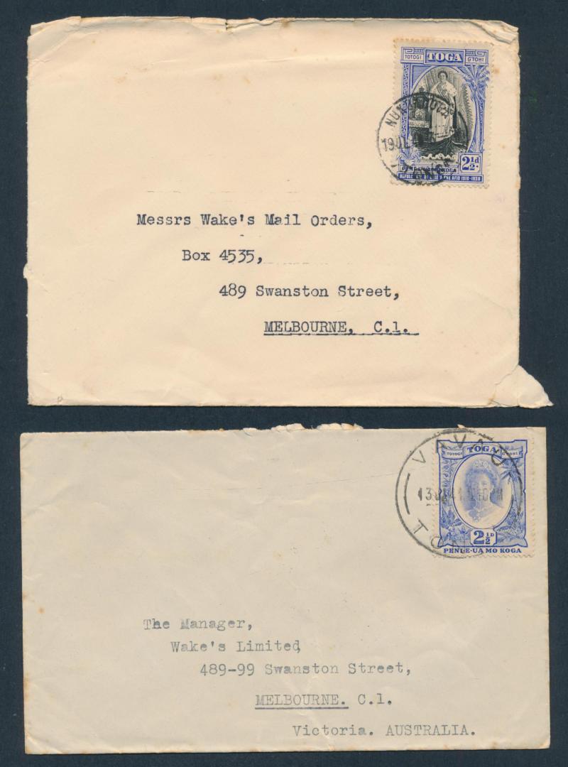 POSTAL HISTORY: 1942 envelope to a mail order house in Melbourne with Salote 1½d & 7½d tied by Nukulaofa cds, black/pale blue 'BY