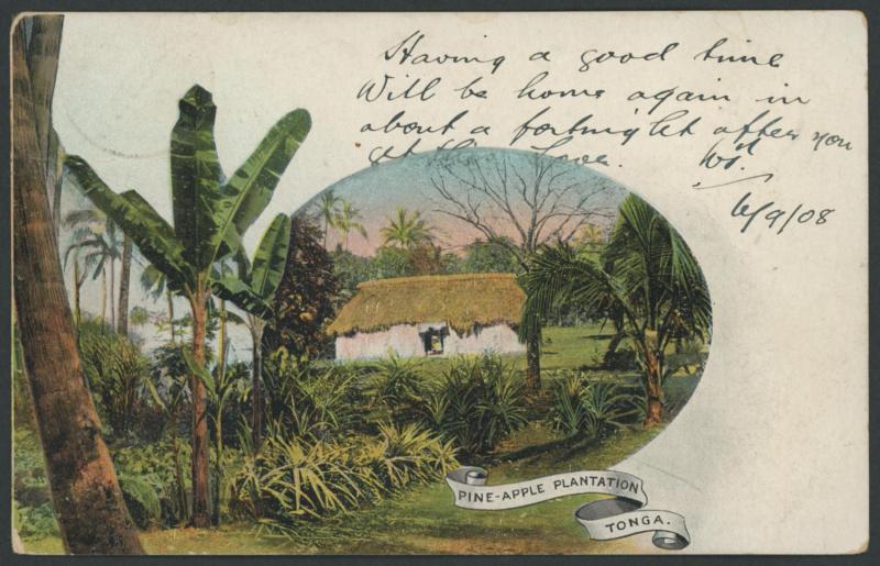 POSTAL CARDS: 1908 (Sep 6) usage of 1d with Multicoloured Views 'PINE-APPLE PLANTATION' to South Australia, posted aboard ship with