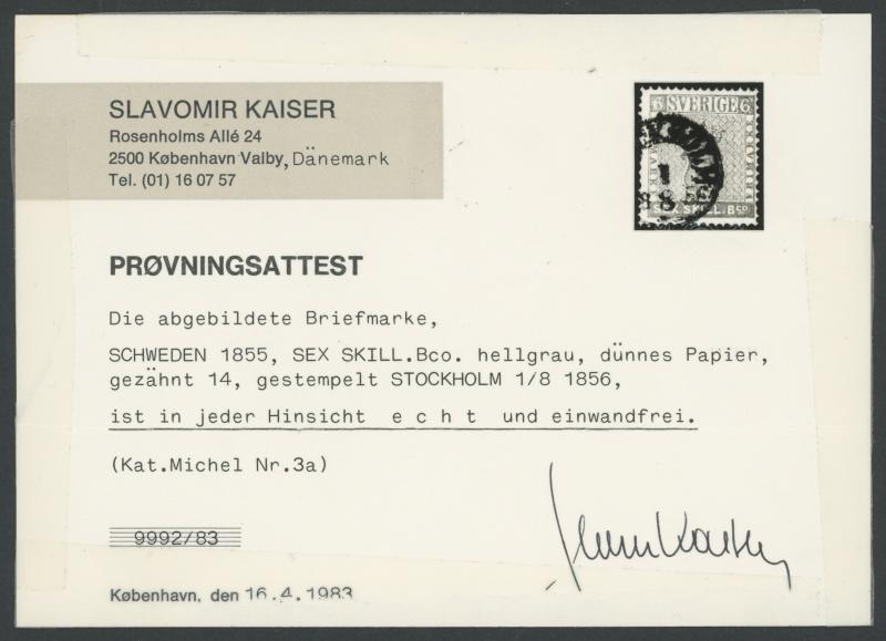 1855-58 Arms 6s grey SG 3 (Michel 3a), well-centred for this issue, untidy Stockholm cds, Cat £1700 (€1100). Slavomir Kaiser