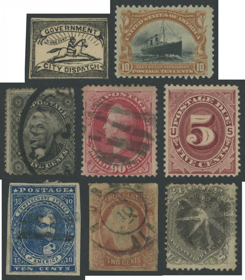 1902-03 Bureau to $1 used, 1904 Louisiana Expo set (ex 1c) *, then to 1950s mostly used, also Confederate States including 1861 Davis 5c green * & Jefferson 10c dark blue used and 1863 Jackson 2c brown-red used (US$1000+), City Despatch 1c black *