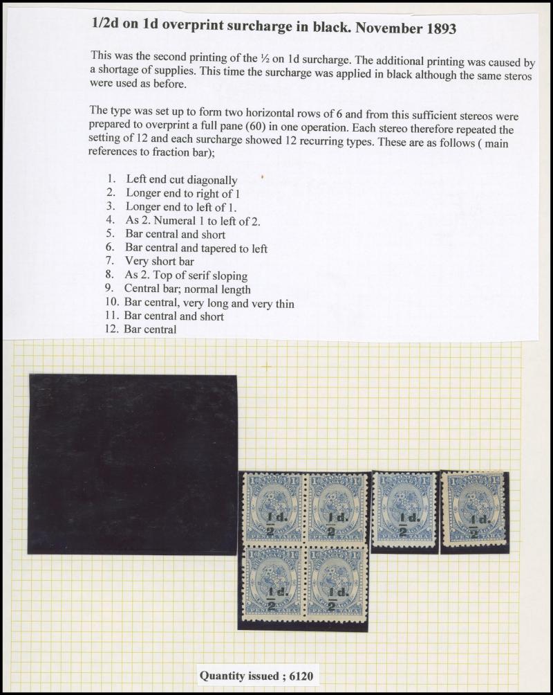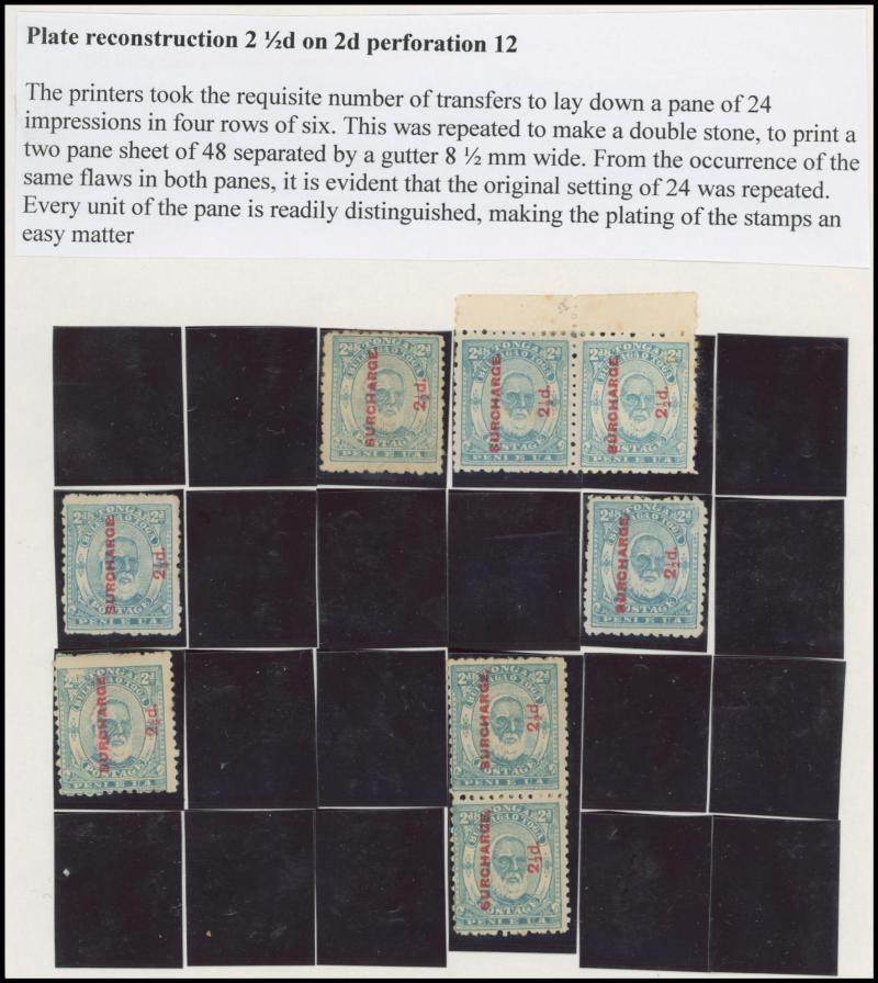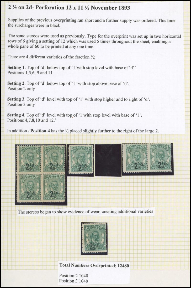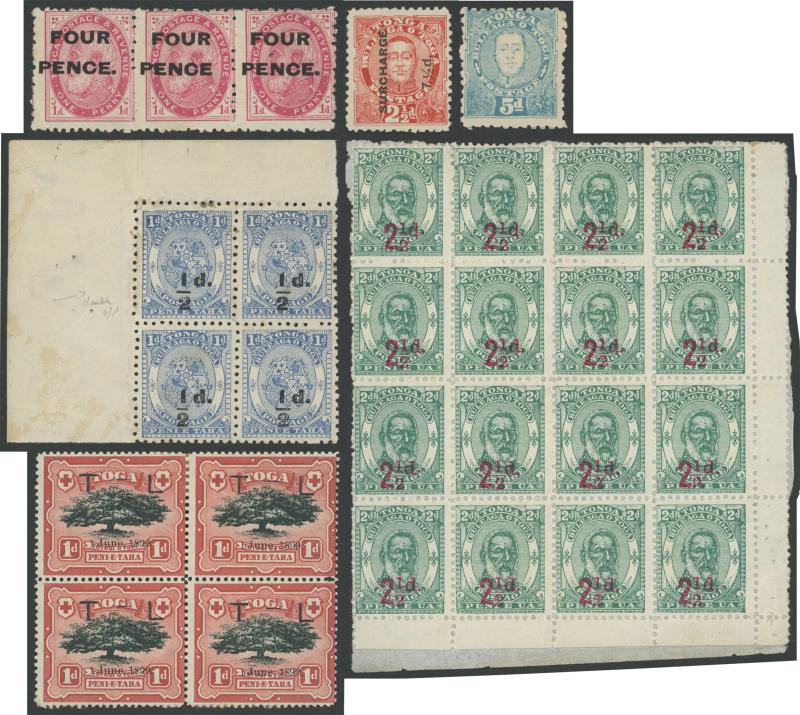 Surcharges '2½d' in red block of 16 (4x4; backing paper adhesion) showing the different overprint types and '½d' in black partial reconstruction (10 including blocks of 4 x2), 1894 Surcharges range, 1895 Surcharges on 2d pale blue including partial