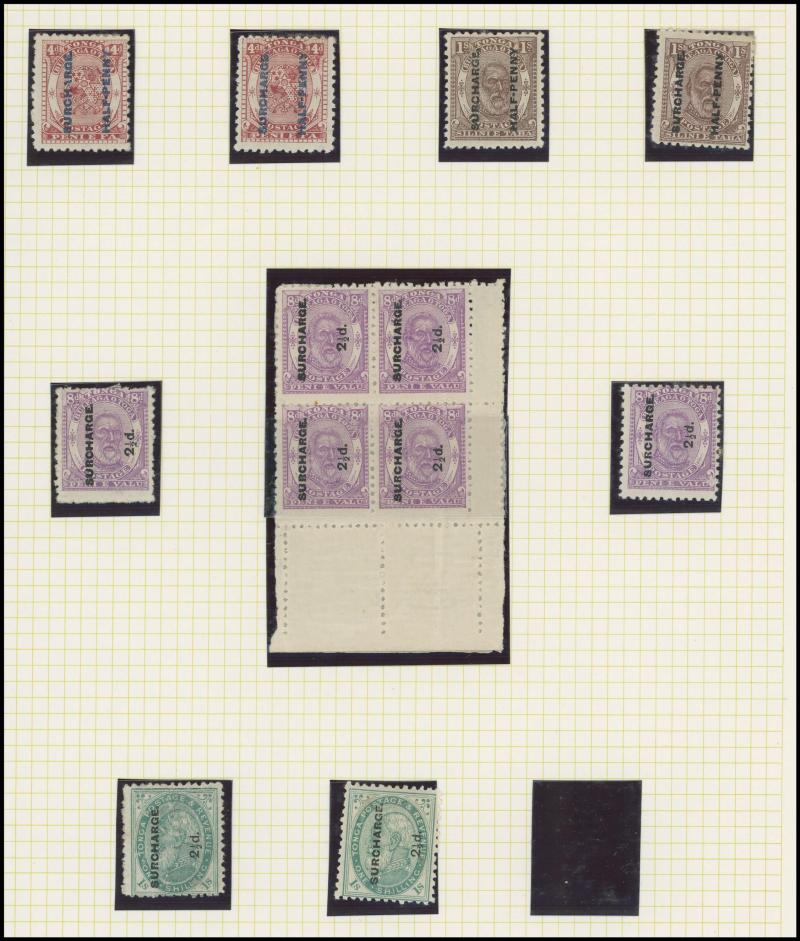 reconstructions, 1895 Surcharges on Unissued 2½d vermilion ½d, 1d & 7½d set plus 7½d on 'BU' Joined, 1895 King George II set plus 2½d rose Stop after 'POSTAGE' x2 in blocks of 4 and Perf 11 5d blue, 1897 Pictorials range including 2½d No Fraction Bar