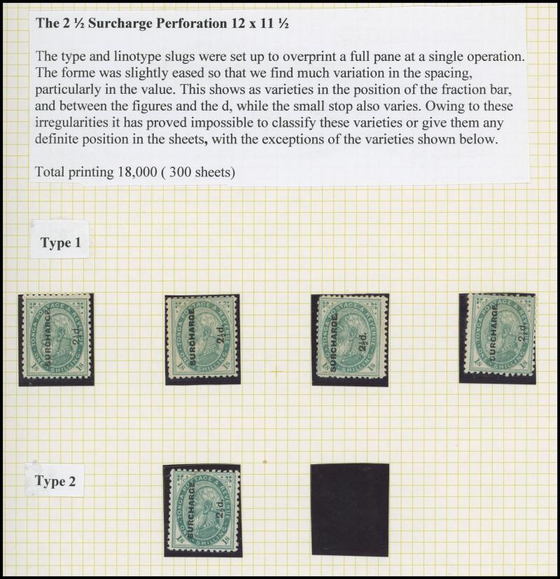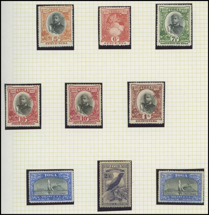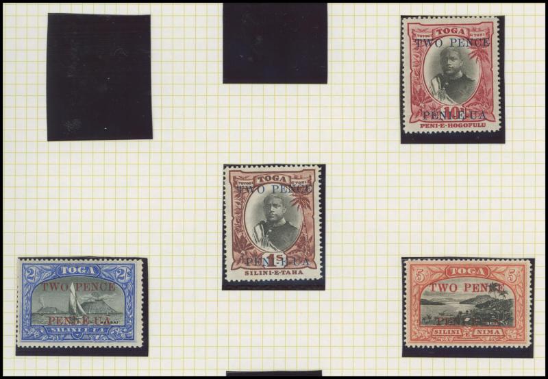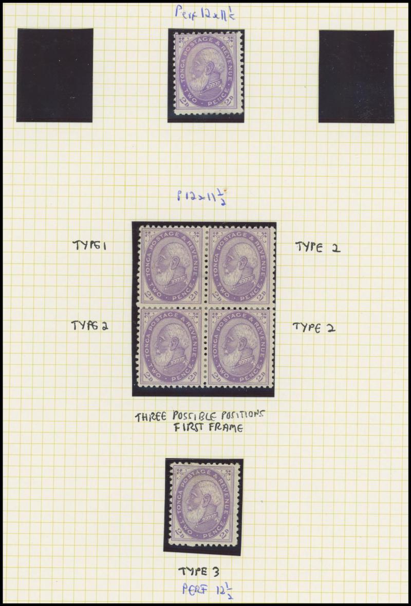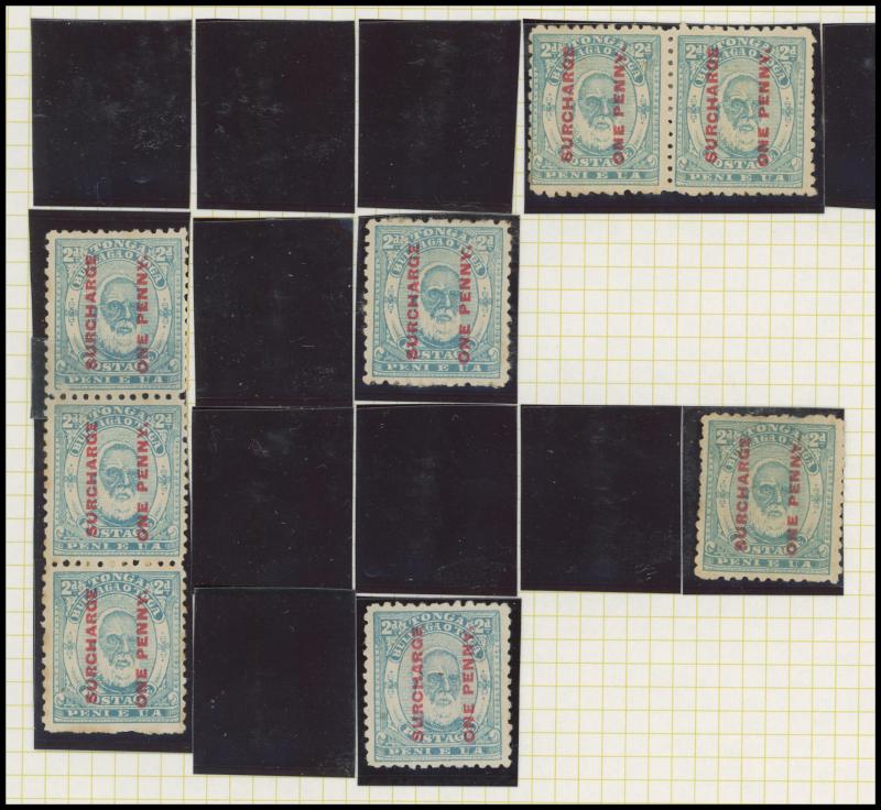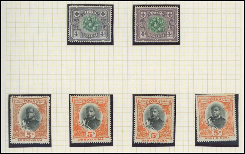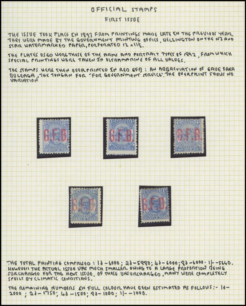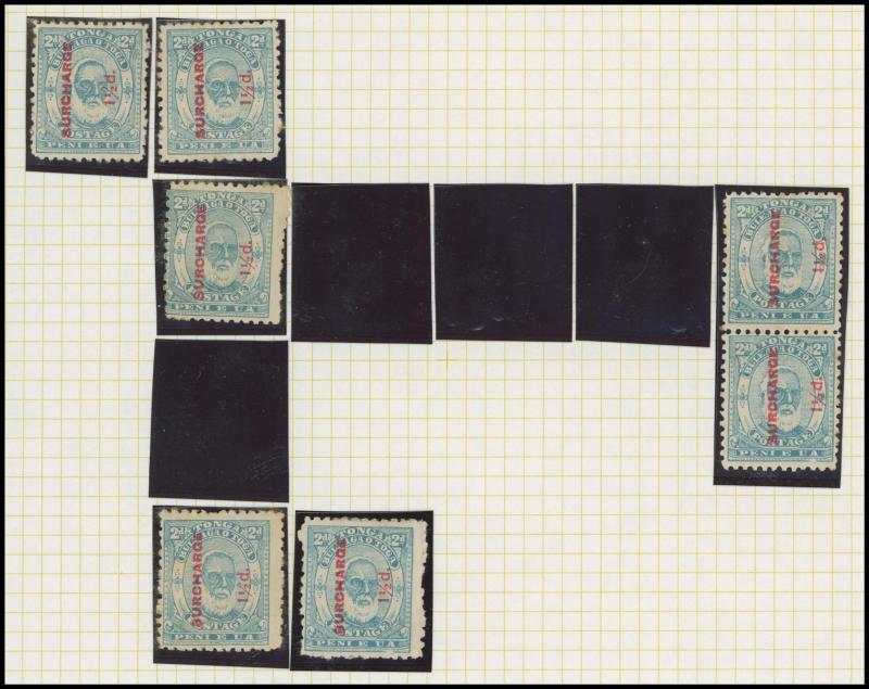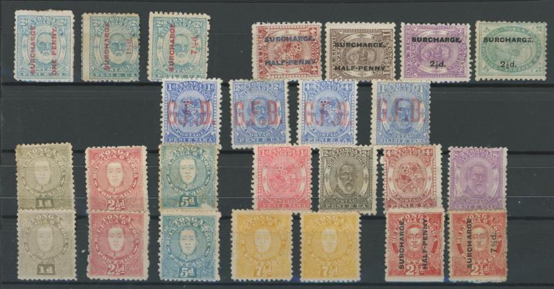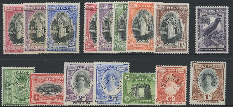 1895 Surcharges on Unissued 2½d vermilion ½d, 1d & 7½d, 1895 King George II set x2, and Official Stamps 1893 'G.F.B.' Overprints set, also 'SPECIMEN' horseshoe punctures 1938 Queen Salote, 1942-49 Pictorials Multiple Script CA Wmk, and 1944 Silver