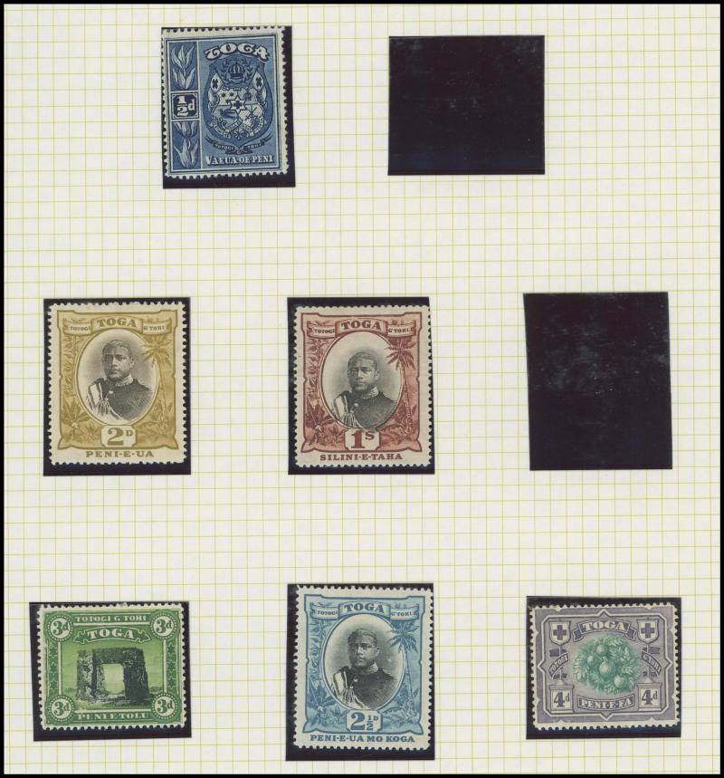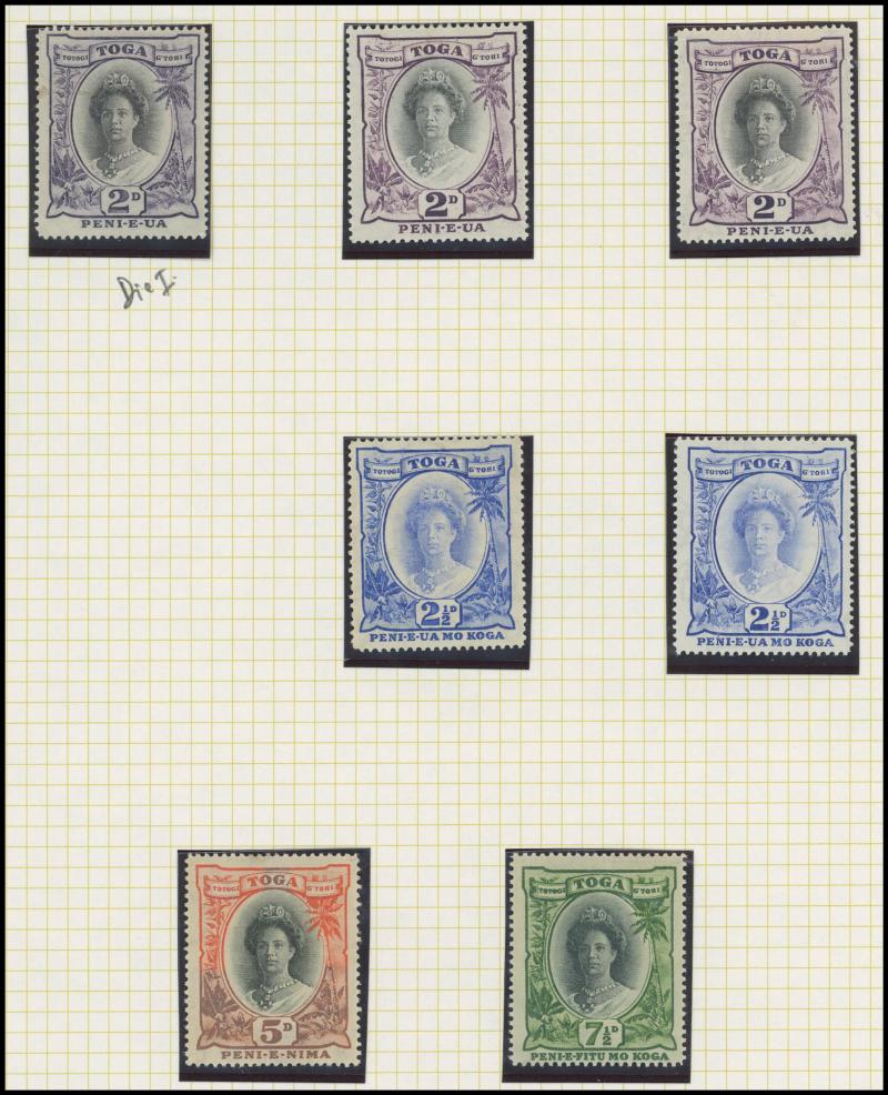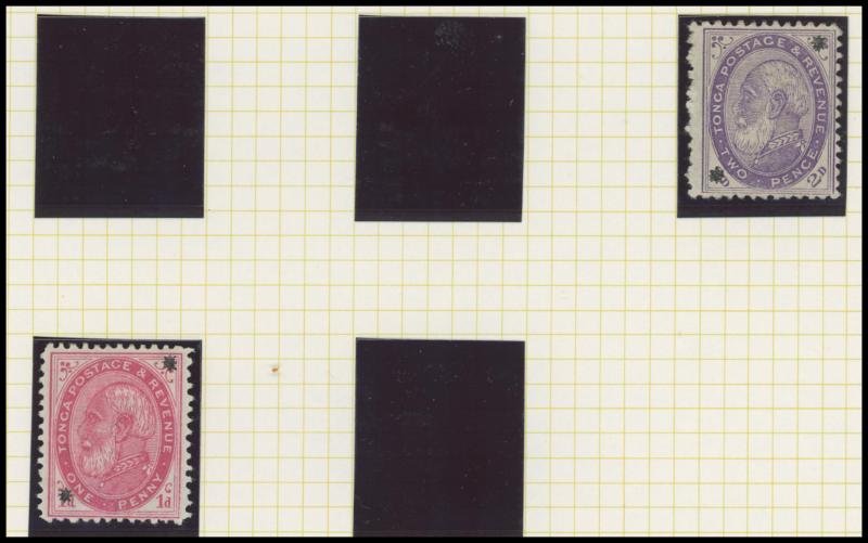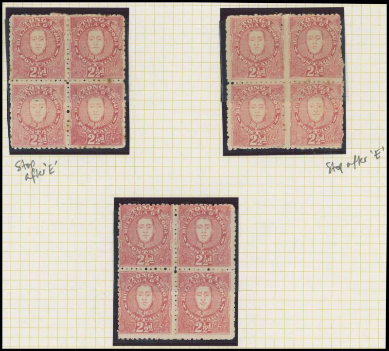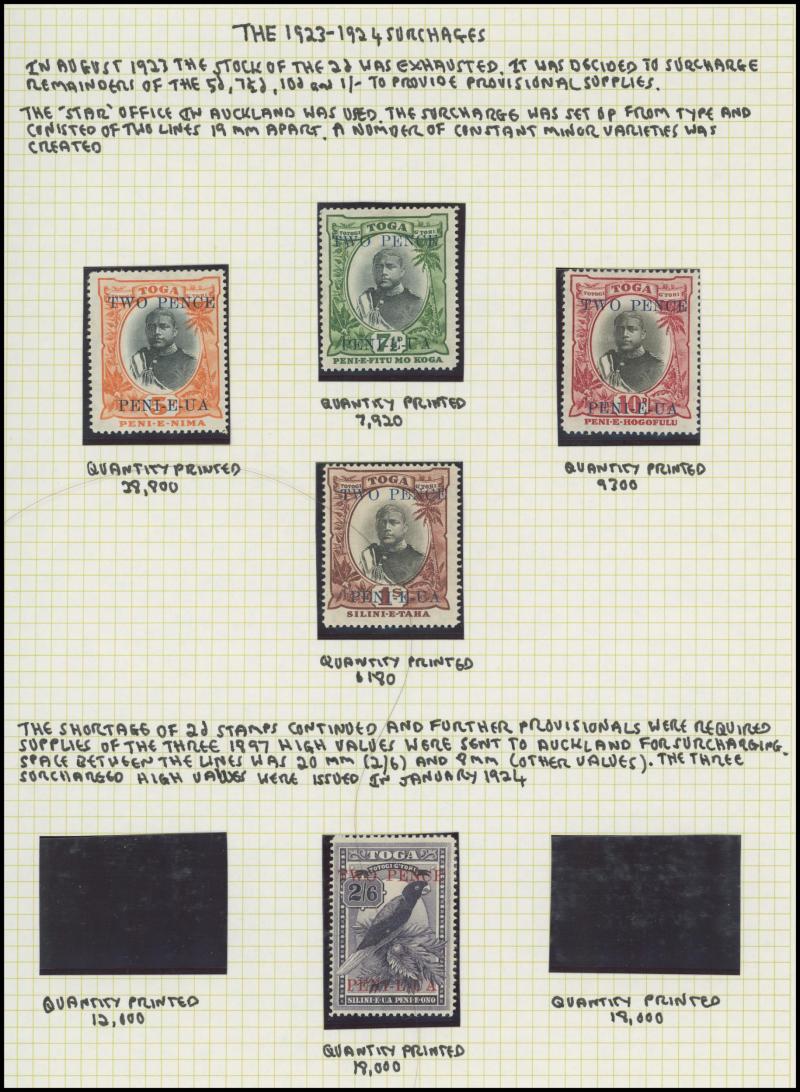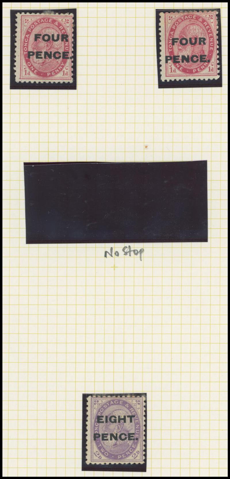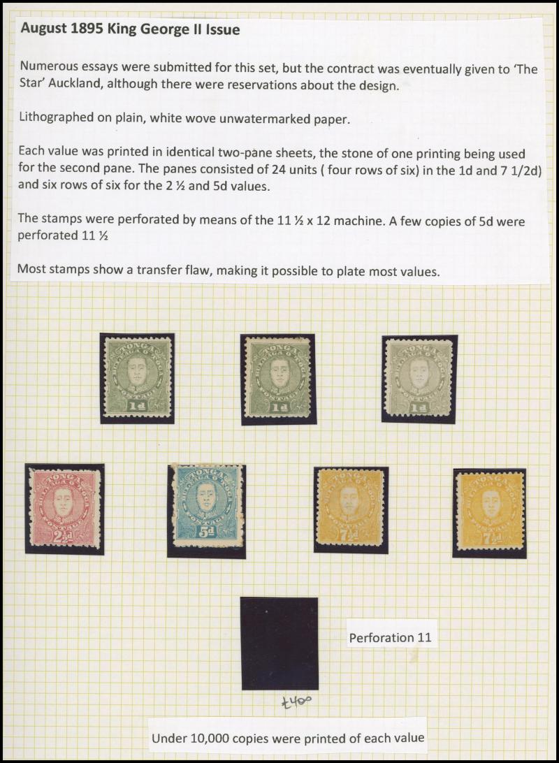 1895 Surcharges on Unissued 2½d vermilion ½d, 1d & 7½d, 1895 King George II set x2, and Official Stamps 1893 'G.F.B.' Overprints set, also 'SPECIMEN' horseshoe punctures 1938 Queen Salote, 1942-49 Pictorials Multiple Script CA Wmk, and 1944 Silver
