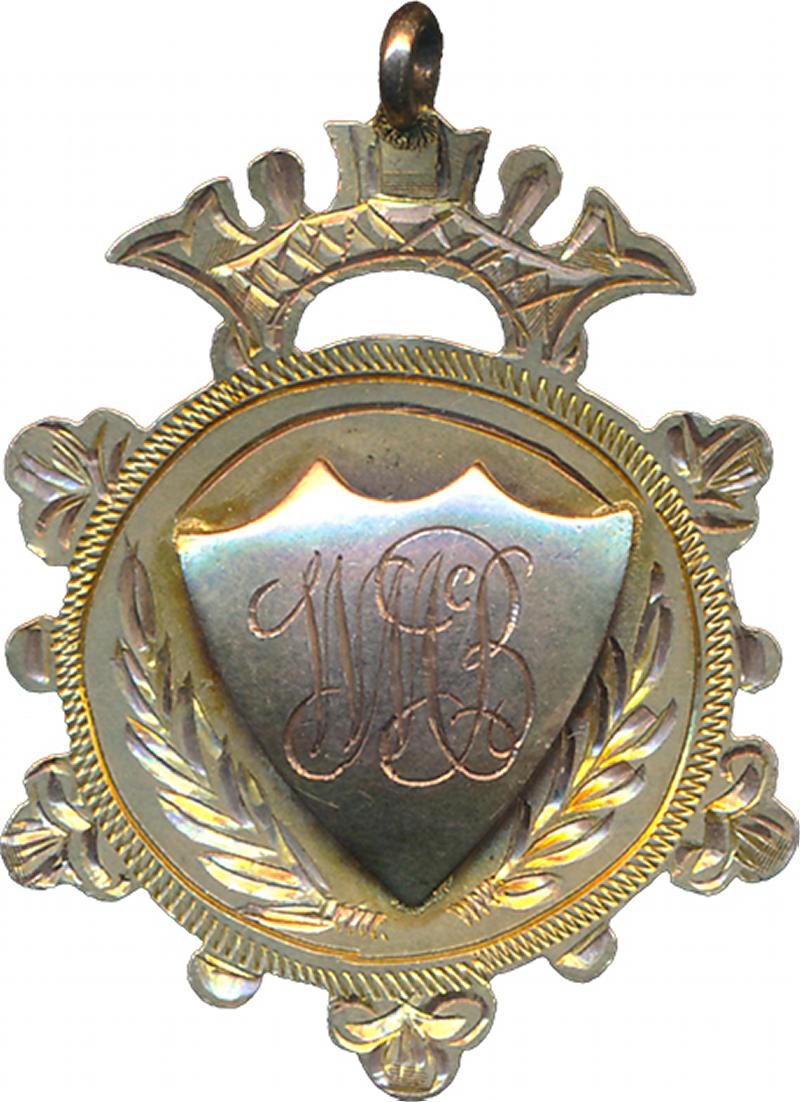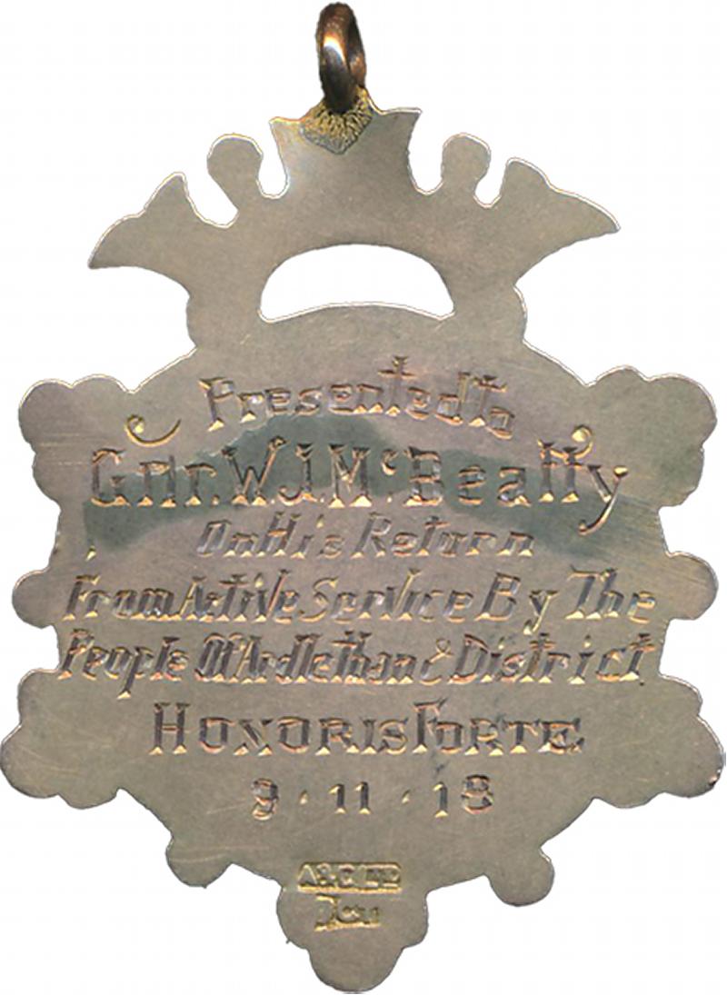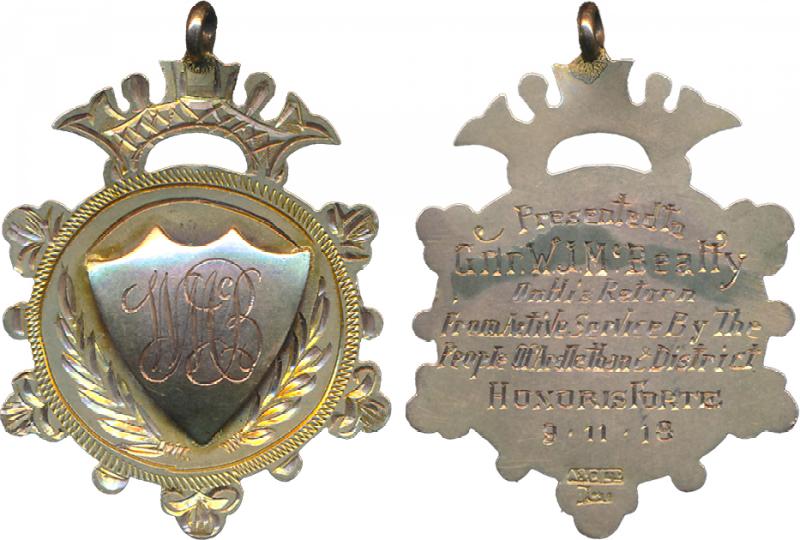 9ct gold fob with shield on front engraved "WJMc", and engraved on reverse "Presented to, Gnr.W.J.McBeatty, On His Return, From