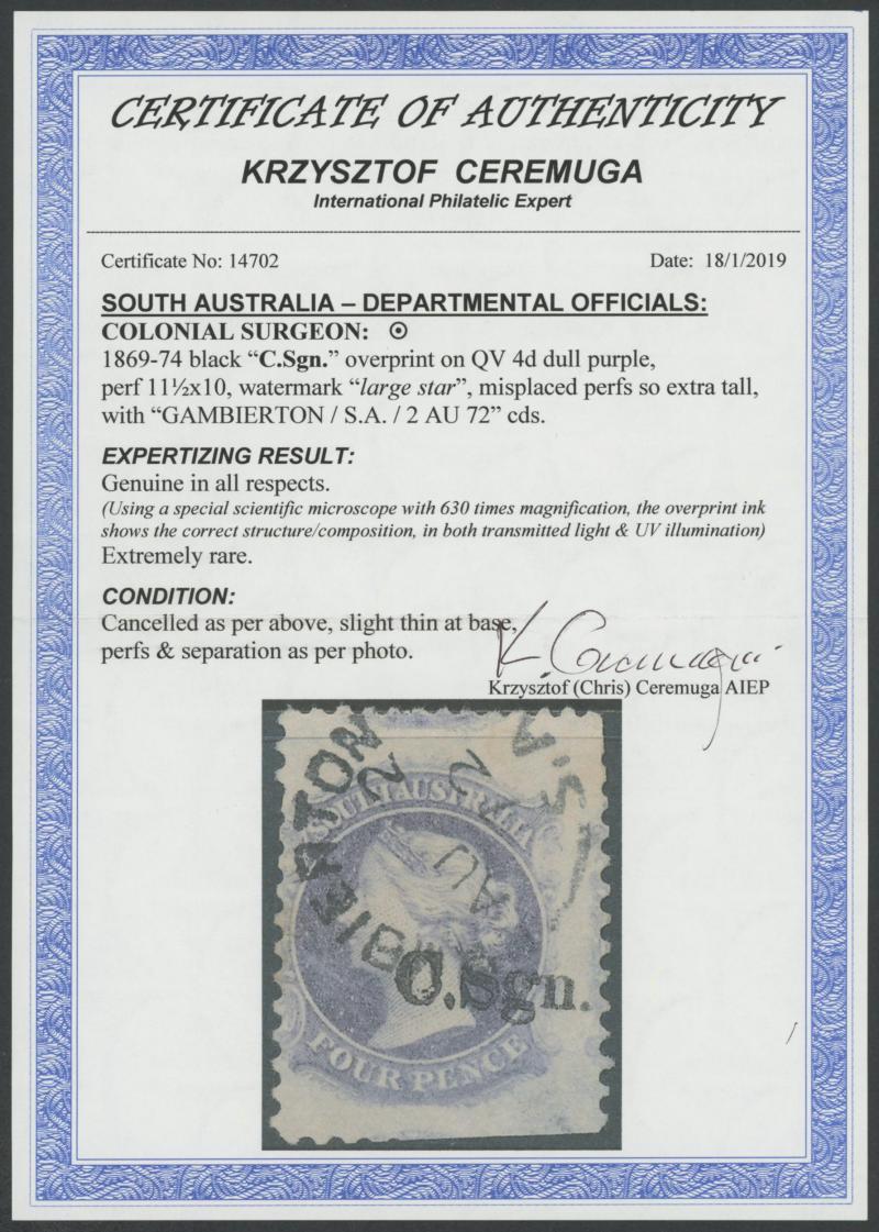 BLACK OVERPRINT: 'C.Sgn.' (seriffed font) on QV Perkins Bacon Large Star Wmk Perf 10 4d deep violet SG DO172 with an Extra Row of