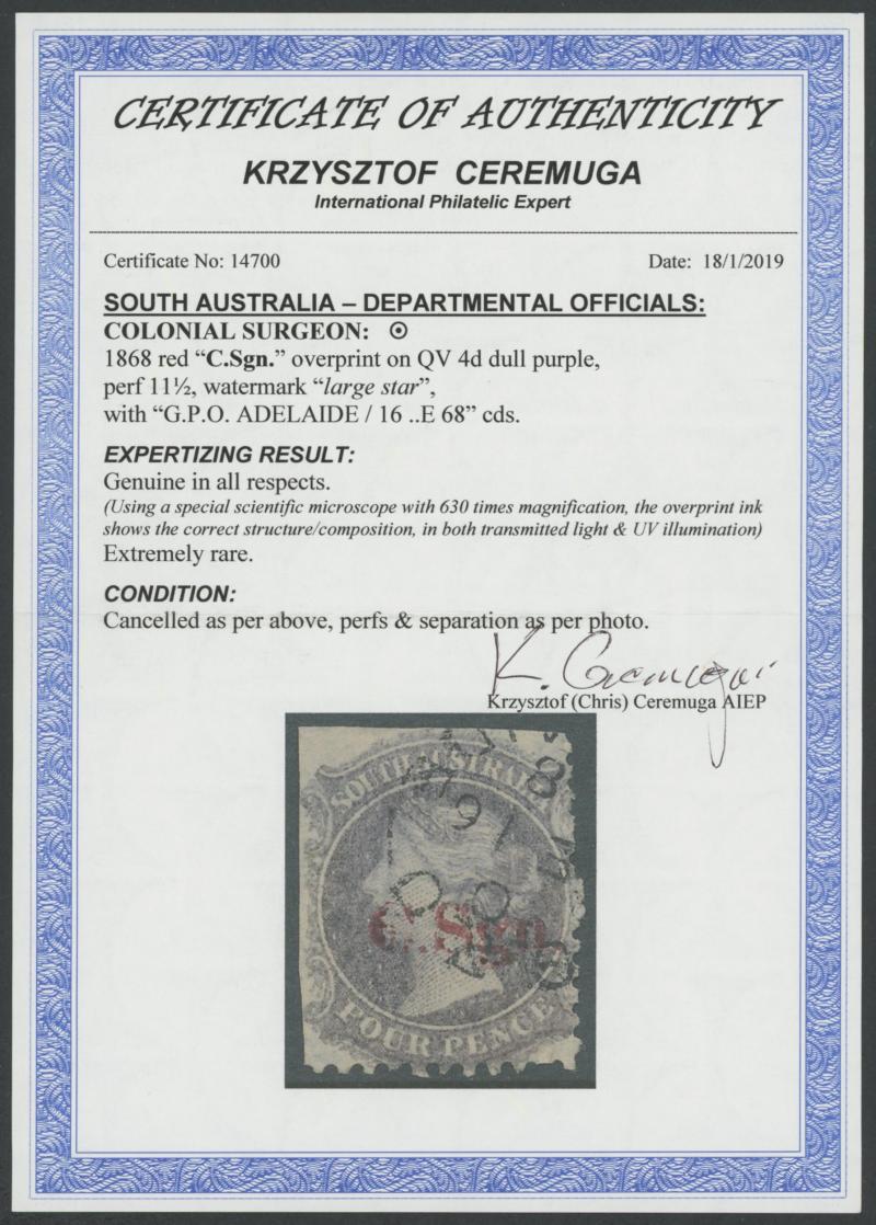 RED OVERPRINT: 'C.Sgn.' (seriffed font) on QV Perkins Bacon Large Star Wmk Perf 11½-12½ 4d slate-purple SG DO163, cut from the