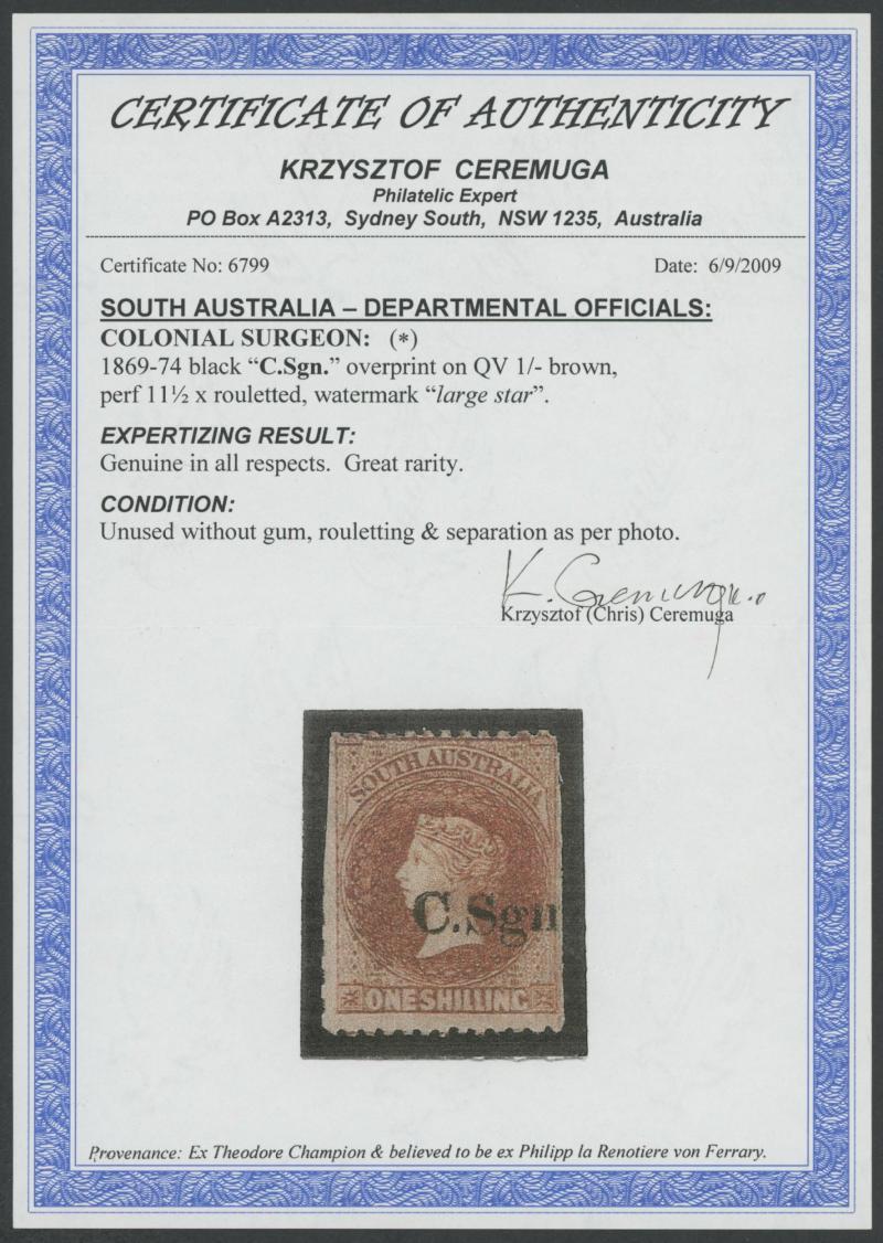 'Besancon' and Don Pearce collections. This is also the only 1/- stamp - unused or used - recorded for the Colonial Surgeon. (Image1) (Image2)