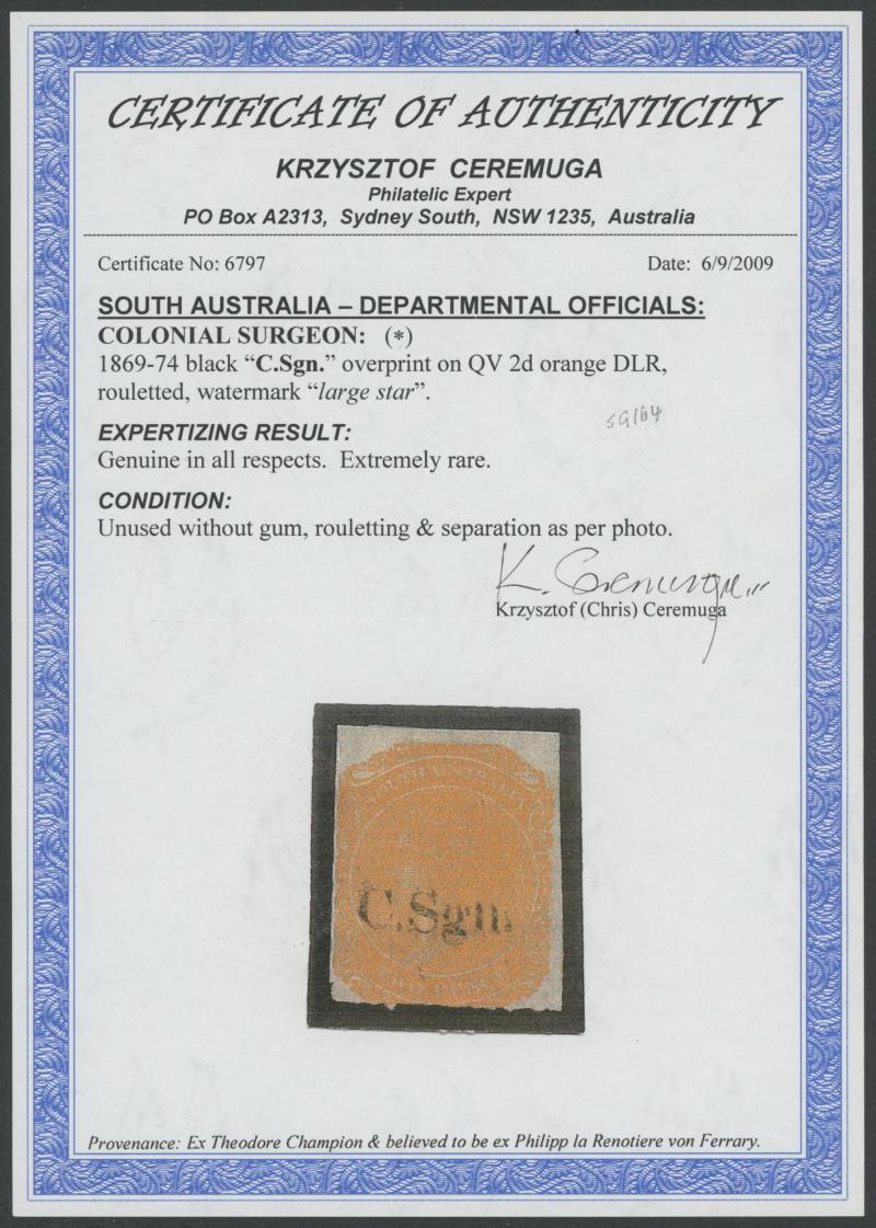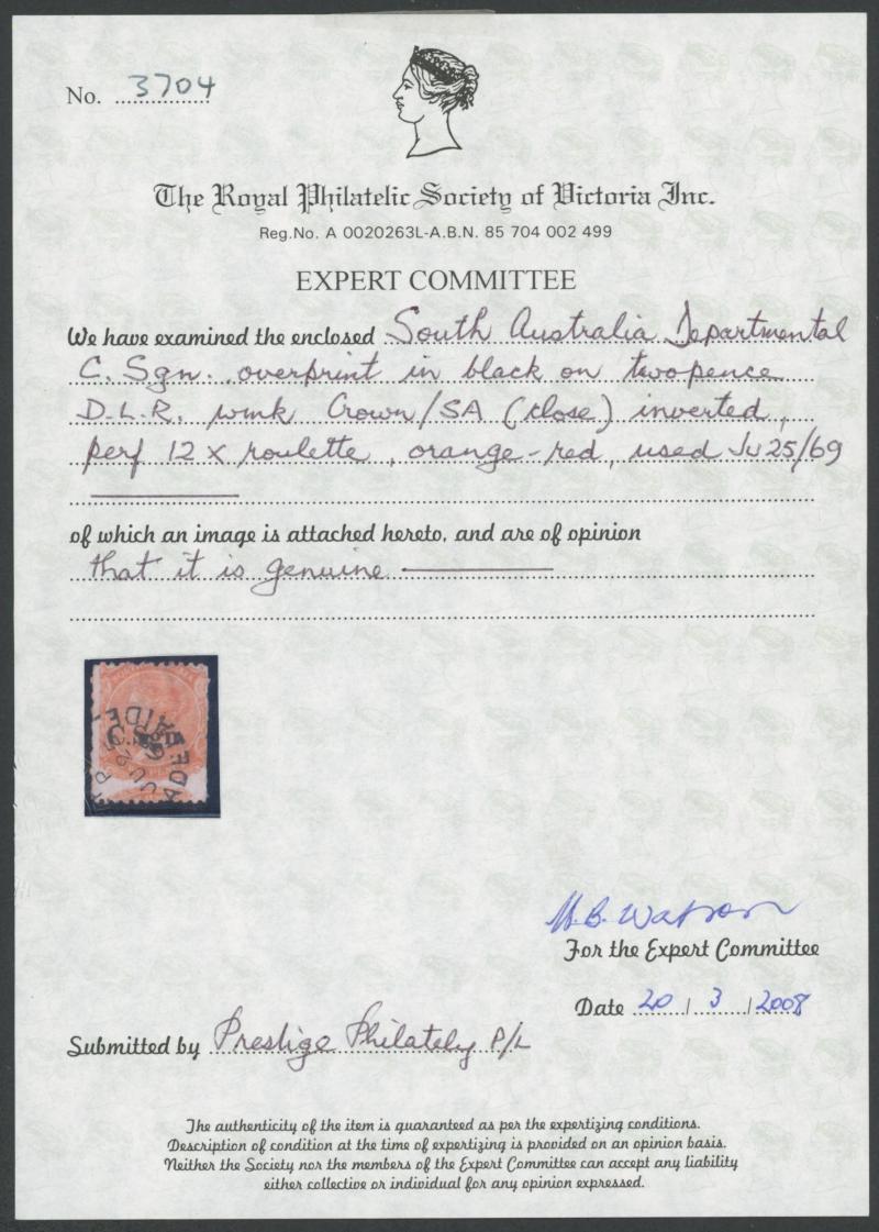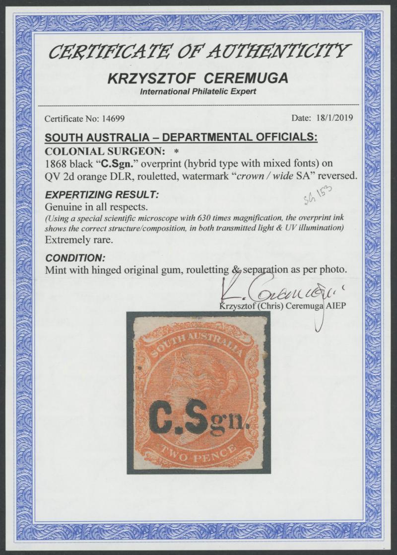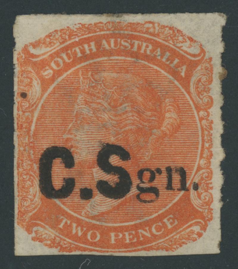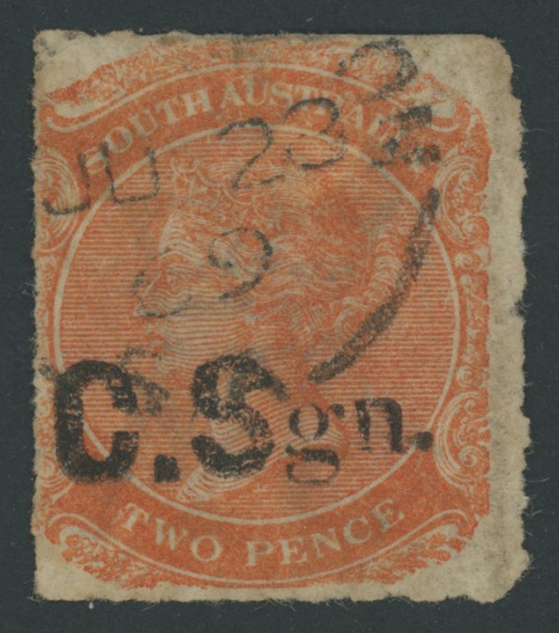 BLACK OVERPRINT: 'C.Sgn.' (seriffed font) on QV De La Rue Crown/SA Wmk Rouletted 2d red-orange SG DO164, minor adhesion stain (not