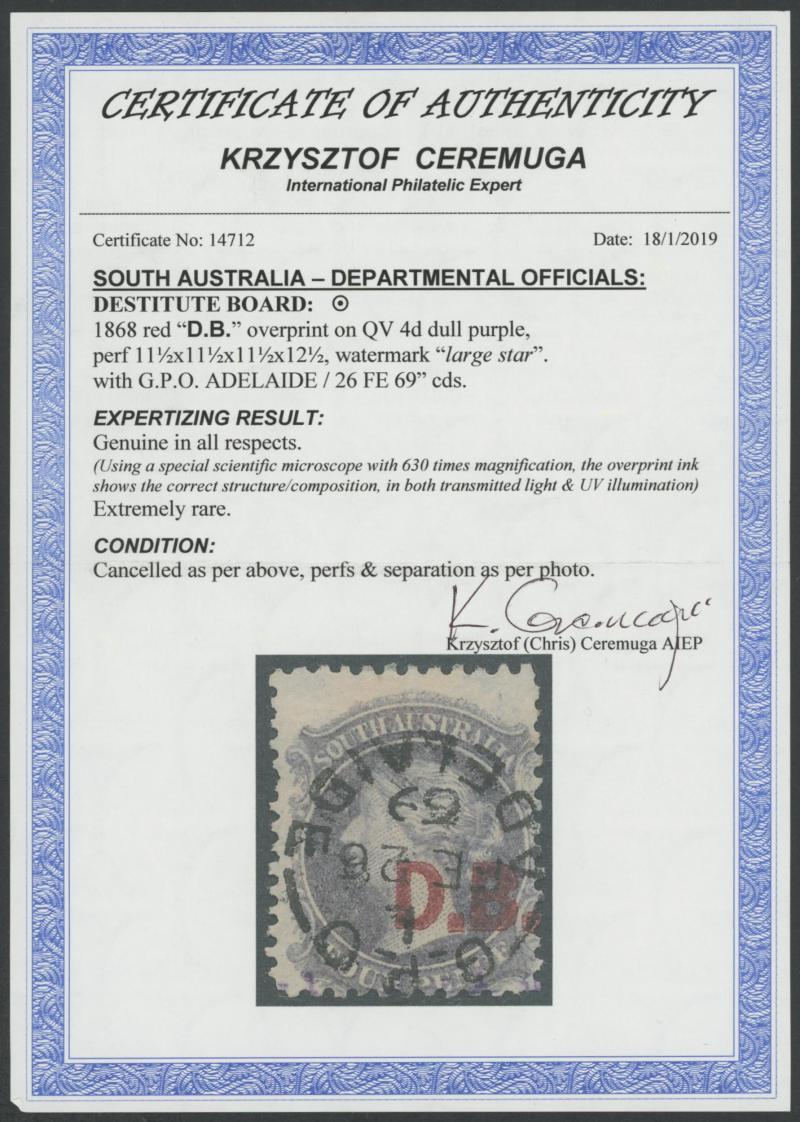 RED OVERPRINT: 'D.B.' on QV Perkins Bacon Large Star Wmk Perf 11½-12½ 4d slate-purple SG DO178, GPO cds of 'FE26/69', Cat £2750.