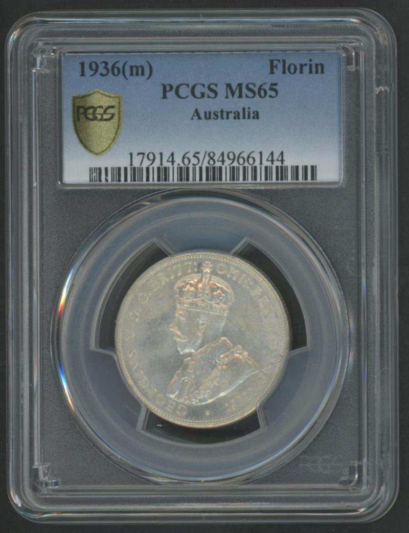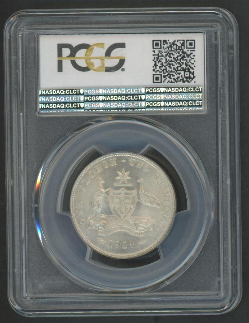 1936 KGV 2/- in PCGS holder graded 'MS65', Cat $450 for Unc, $850 for ChUnc. (Image1) (Image2)