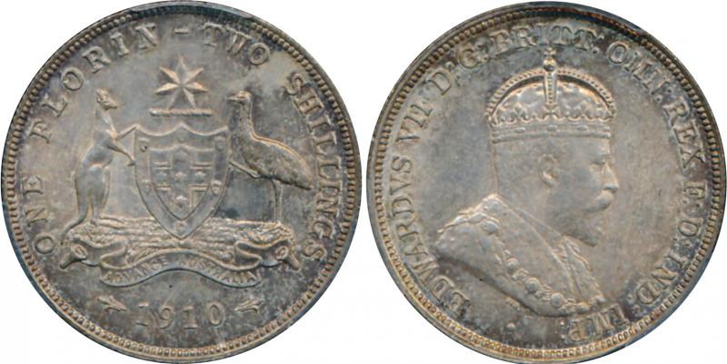 1910 KEVII 2/-, well struck with sharp point to star, in PCGS holder graded 'MS63', even overall toning, Cat $3250 for Unc. (Image1) (Image2)