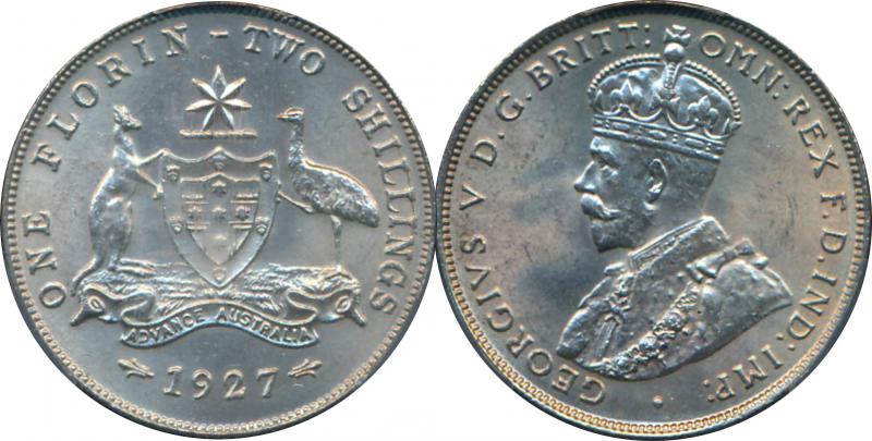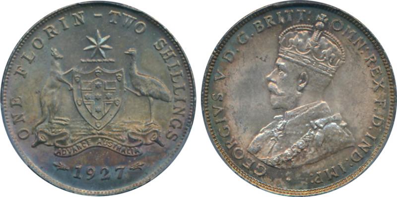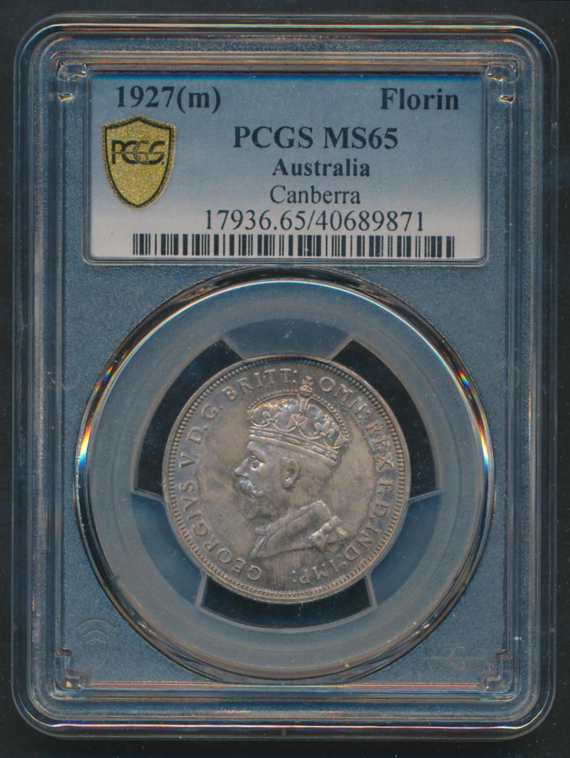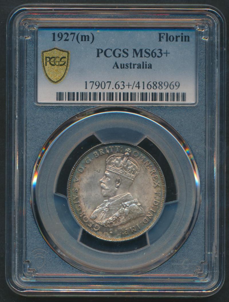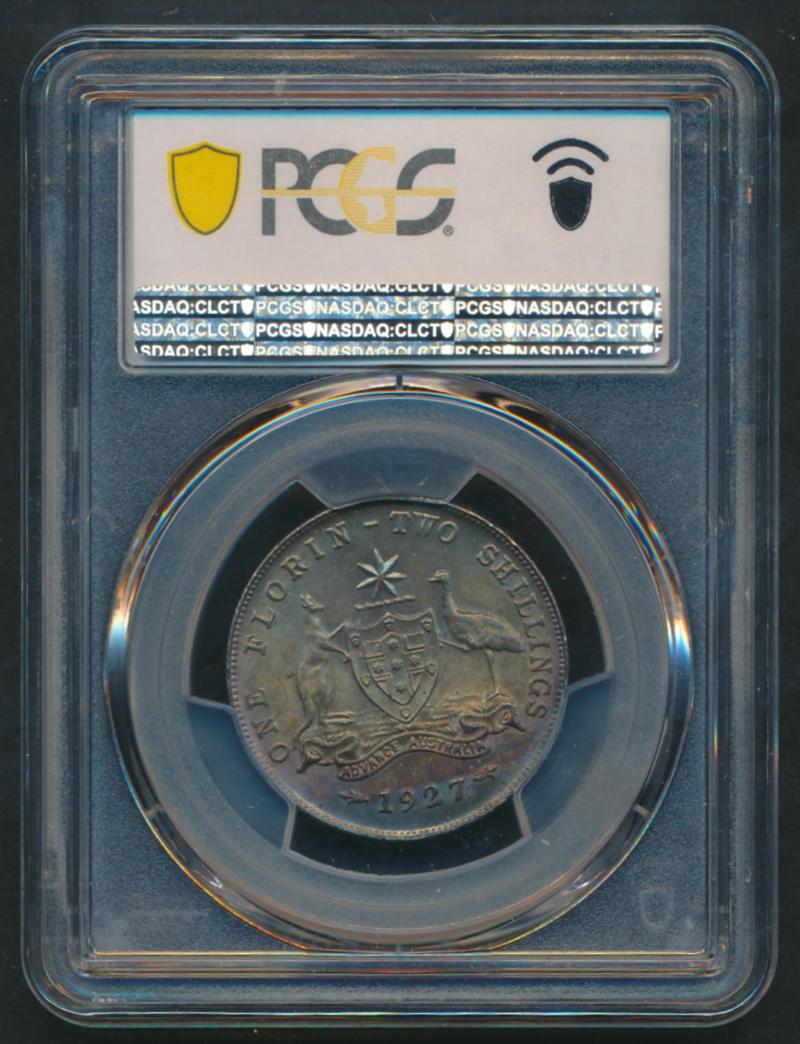 1927 KGV 2/-, well struck in PCGS holder graded 'MS64', Cat $1400 for Unc, $2750 for ChUnc. (Image1)
