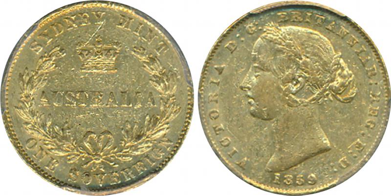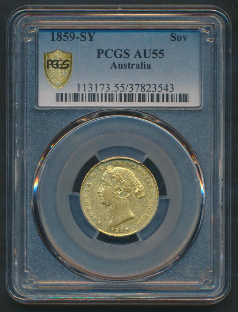 1859 QV Young Head Type II Sydney Mint reverse, Marsh A364, in PCGS holder graded 'AU55'. (Image1) (Image2)