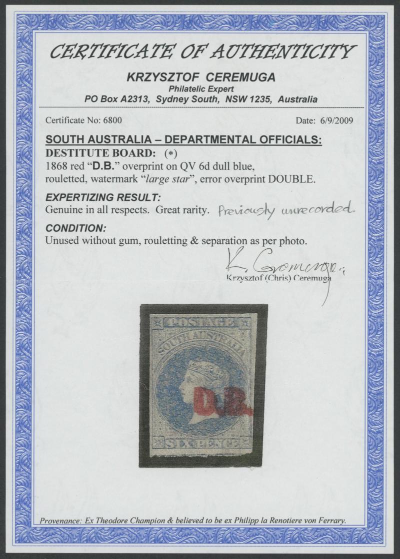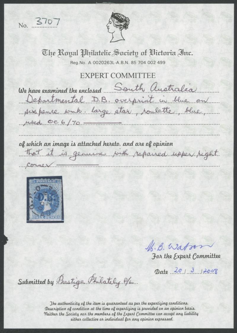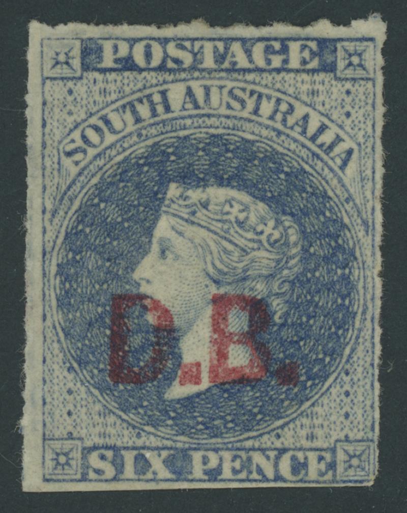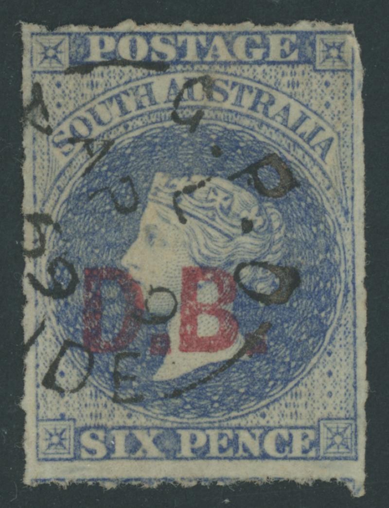 RED OVERPRINT: 'D.B.' on QV Perkins Bacon Large Star Wmk Rouletted 6d dull blue with Double Overprint SG DO176a from the left of