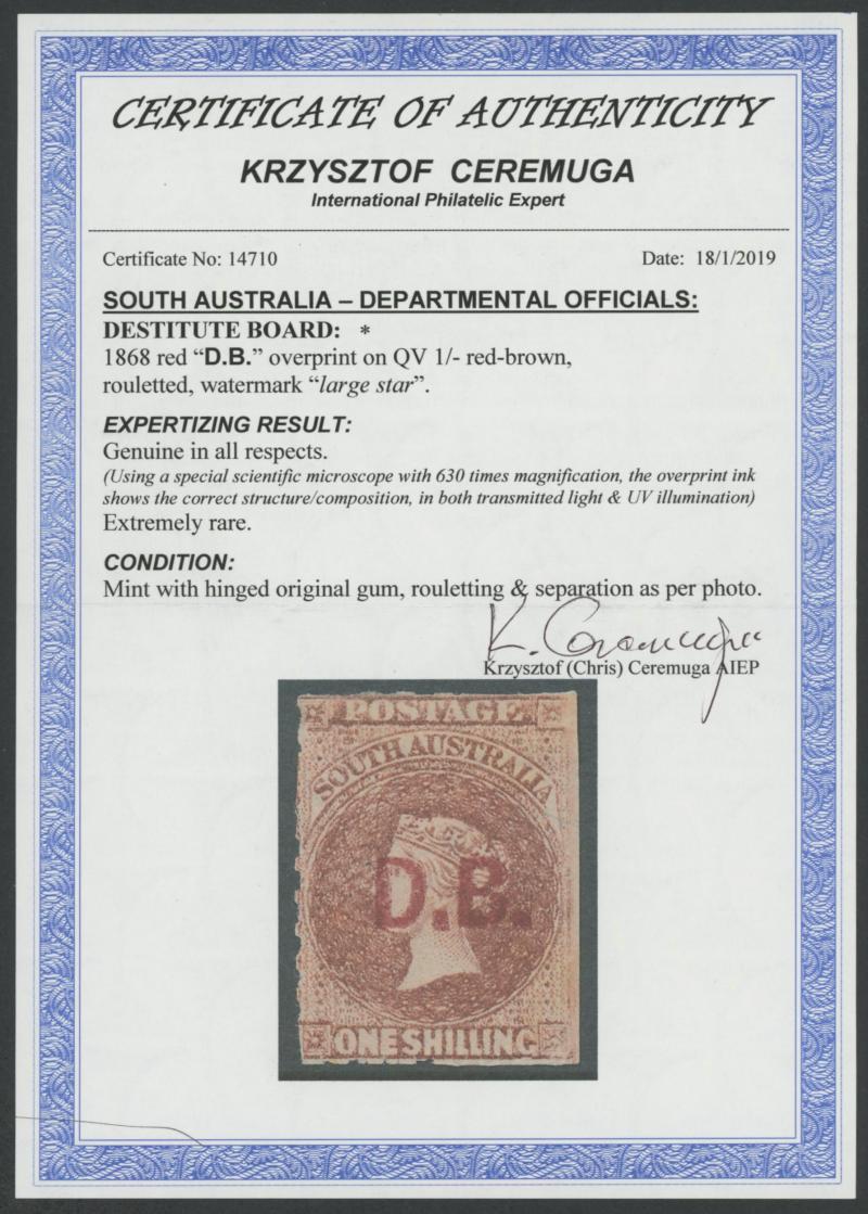 RED OVERPRINT: 'D.B.' on QV Perkins Bacon Large Star Wmk Rouletted 1/- red-brown SG DO177, rouletting except at right where cut