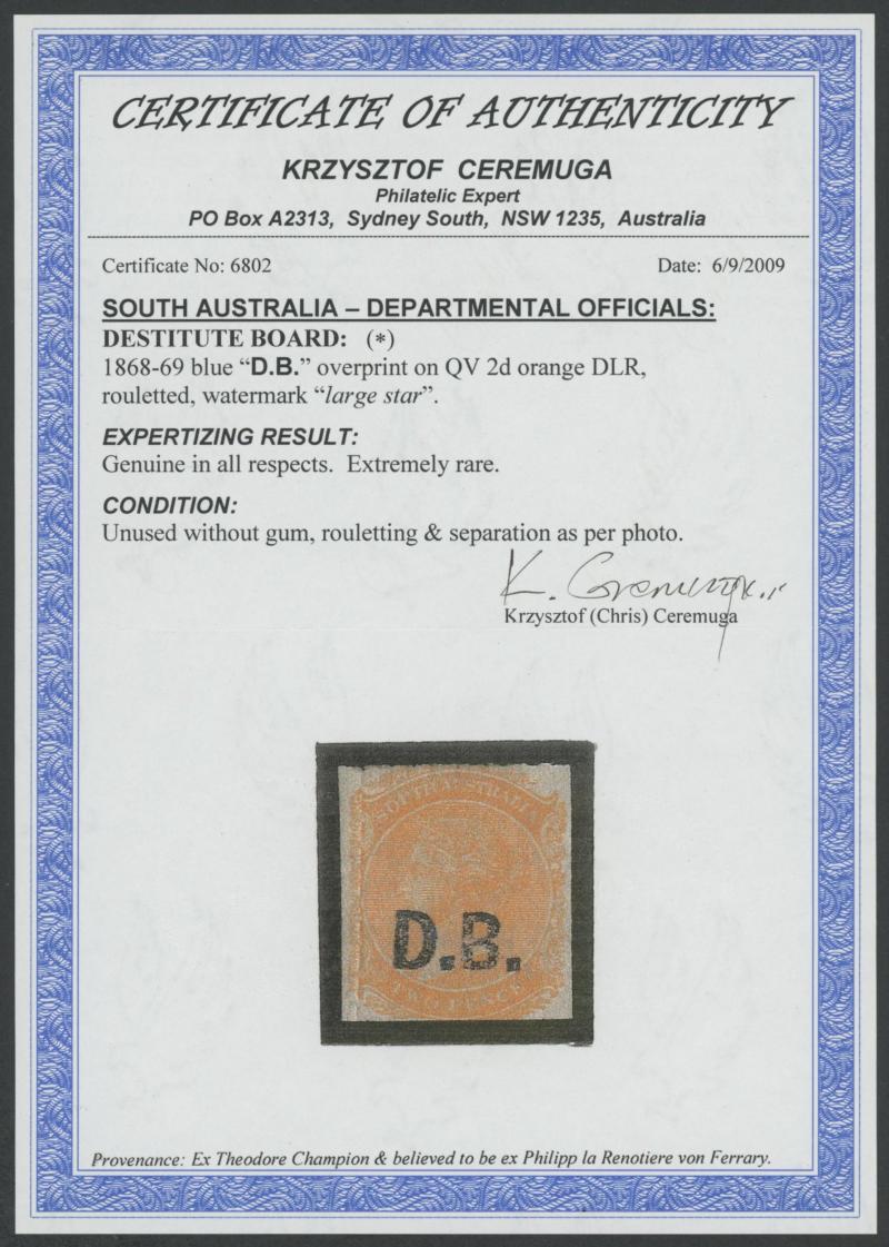 BLUE OVERPRINT: 'D.B.' on QV De La Rue Crown/SA Wmk Rouletted 2d red-orange SG DO179 with the Watermark Reversed, apparently