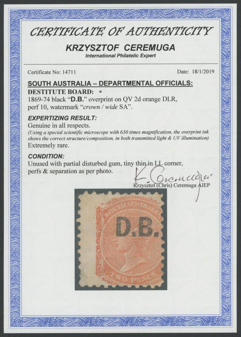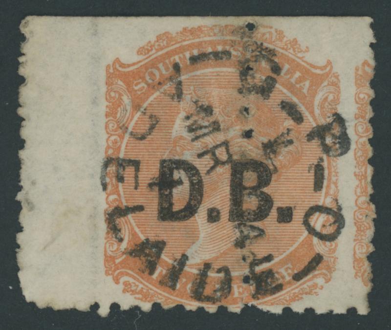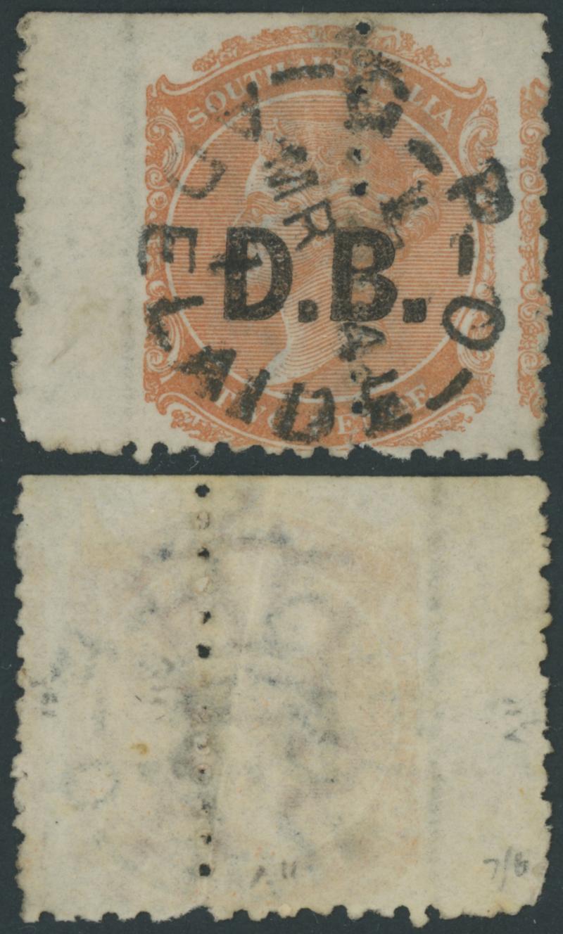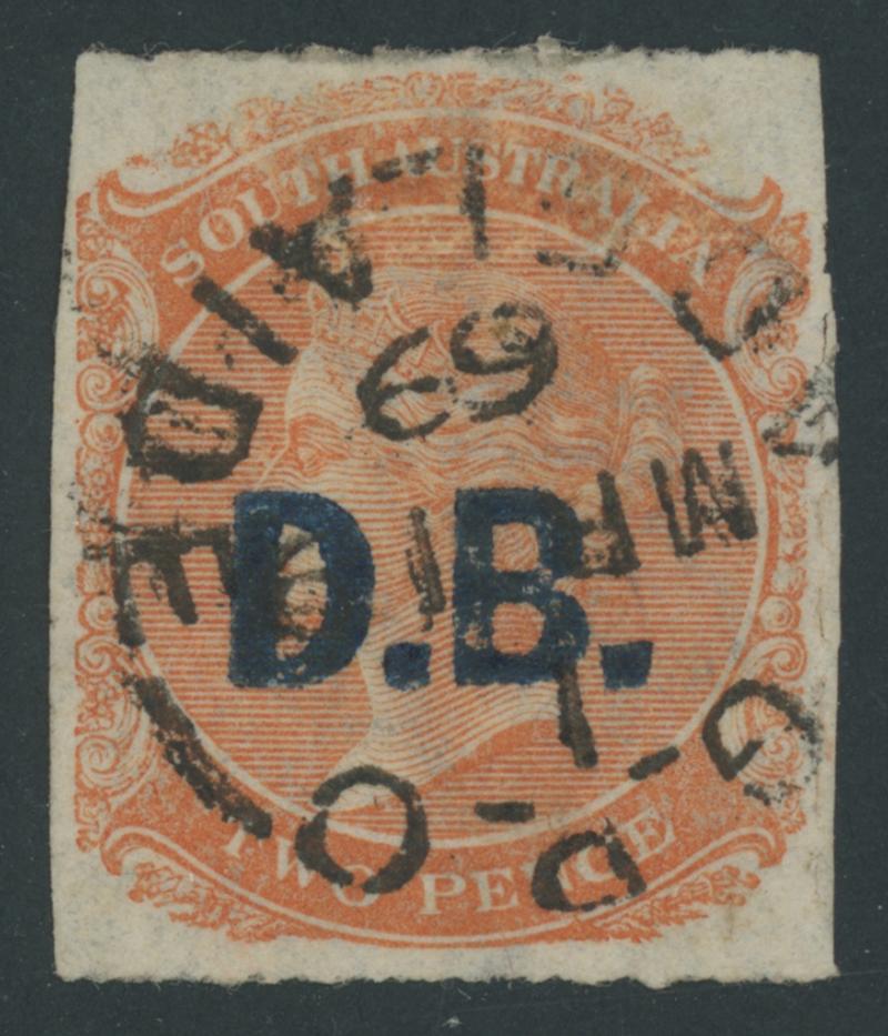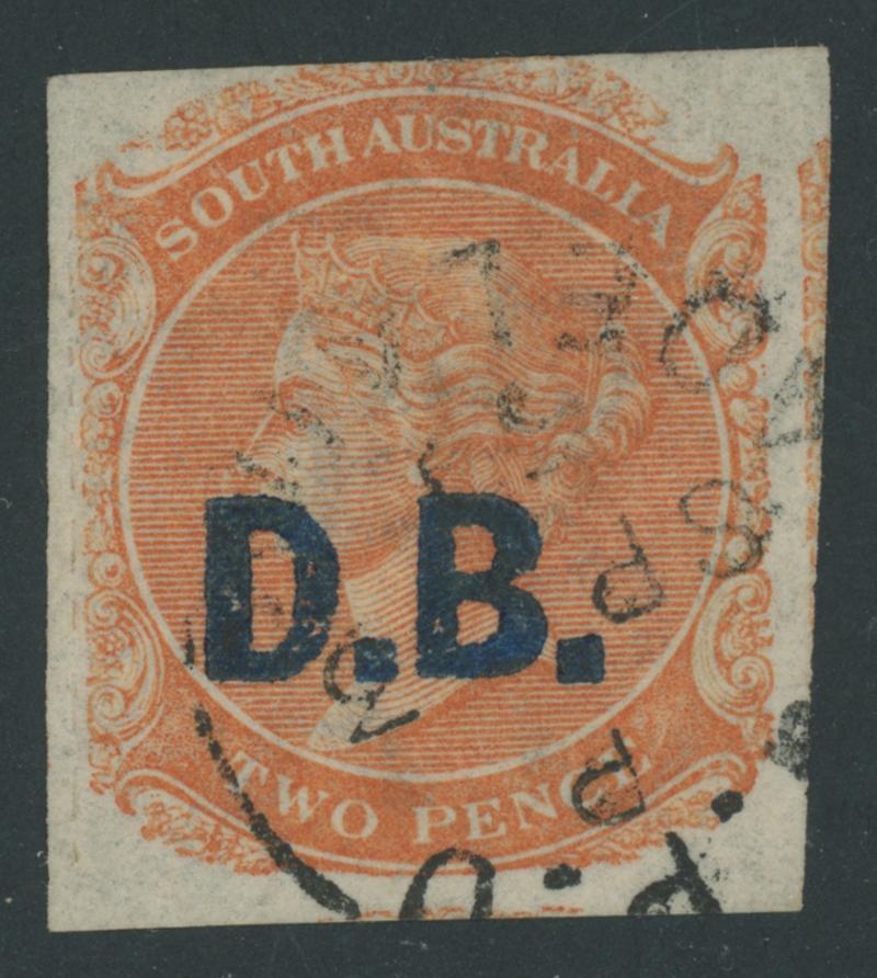 BLACK OVERPRINT: 'D.B.' on QV De La Rue Crown/SA Wmk Irregular Compound Perf 10x10x10x11½-12½ 2d pale orange SG DO189, an unusually