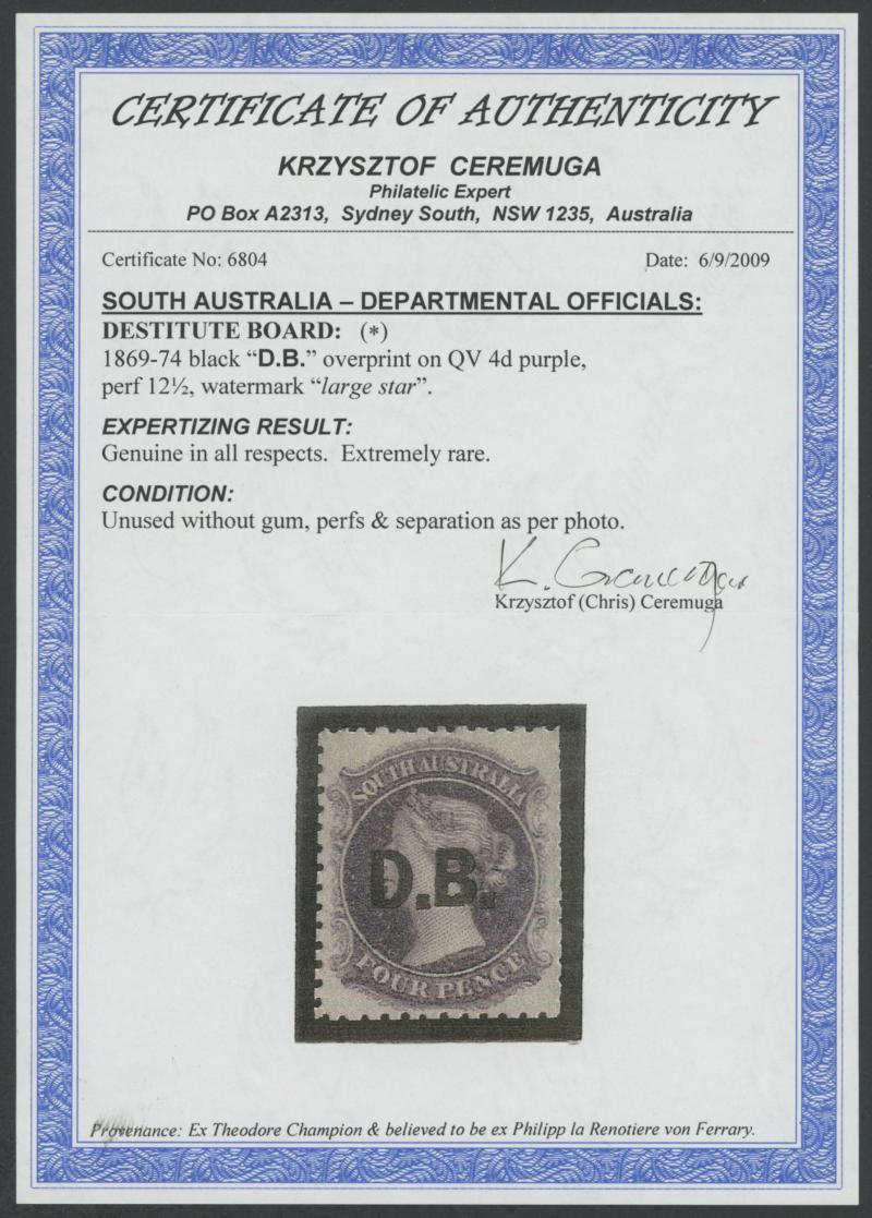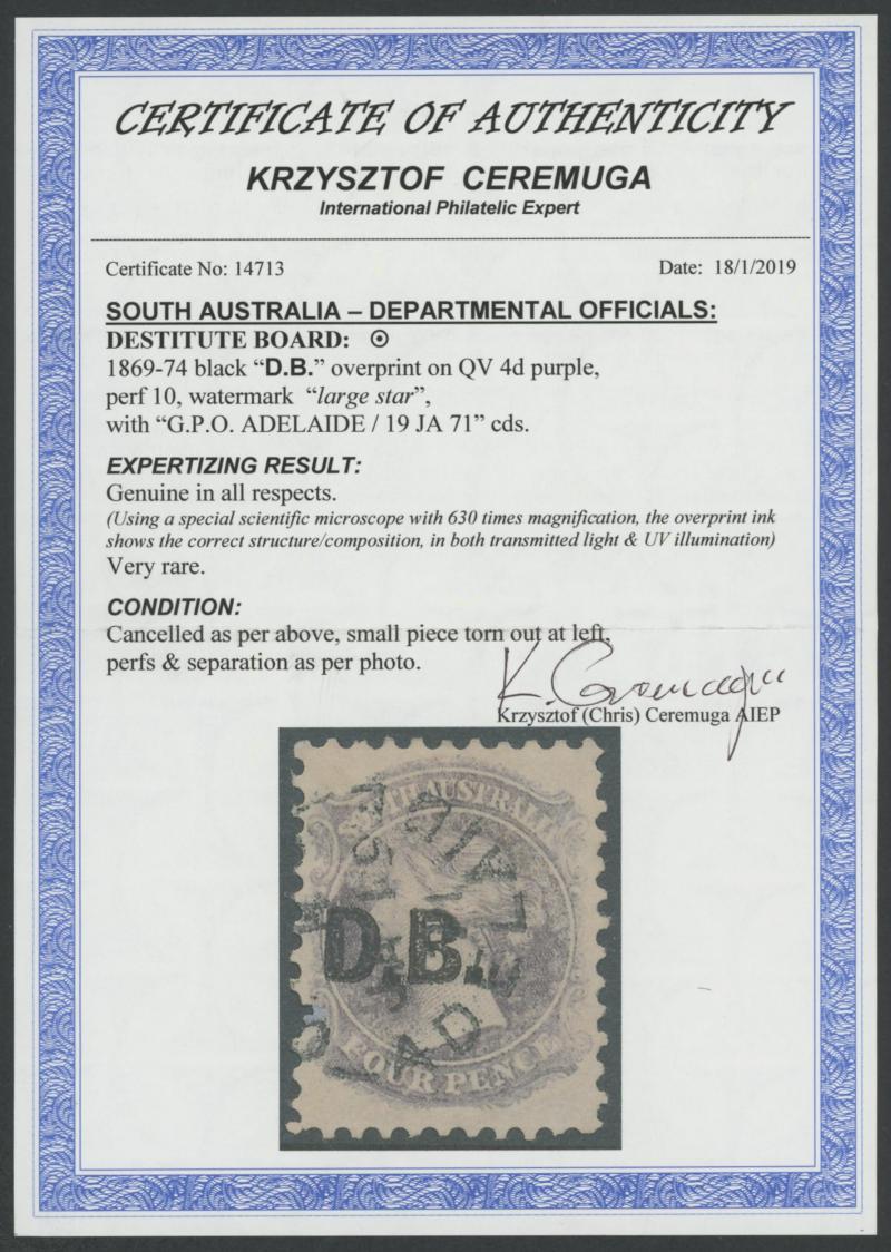 BLACK OVERPRINT: 'D.B.' on QV Perkins Bacon Large Star Wmk Perf 11½-12½ 4d slate-purple SG DO185, remarkably well-centred but with