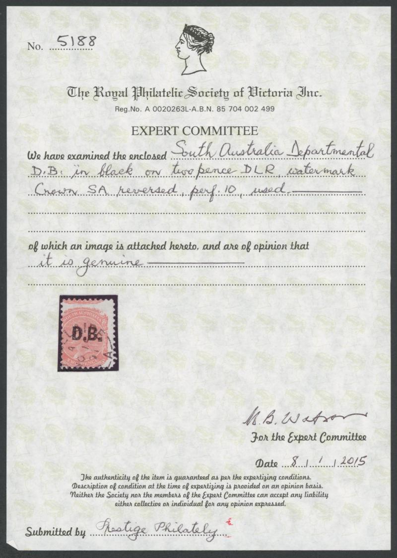 BLACK OVERPRINT: 'D.B.' on QV De La Rue Crown/SA Wmk Perf 10 2d dull orange SG DO186 with the Watermark Reversed, an unusually