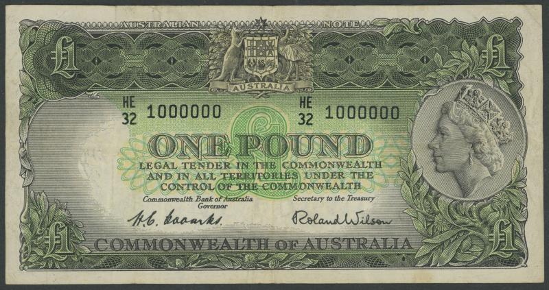 1953 £1 Coombs/Wilson Commonwealth Bank R33m Million Serial 'HE/32 1000000', fold and creases, '1959' in biro on reverse, light