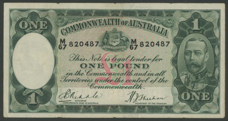 1933 KGV £1 Riddle/Sheehan R28 serial 'M/67 820487', fold and creases, edge nicks, and pin hole, Fine. (Image1) (Image2)