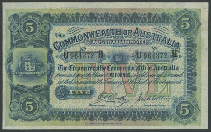 1918 £5 Cerruty/Collins R37b Prefix and Suffix Letter serial 'U 964372 H', two light flattened centre folds, aUnc, Cat $19,500. (Image1) (Image2)