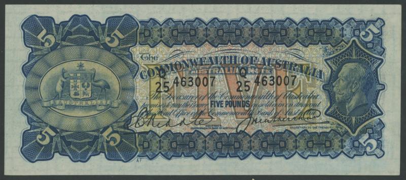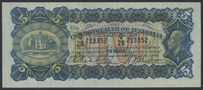 1932 KGV £5 Riddle/Sheehan R43 serial 'Q/28 713352', Uncirculated, Cat $11,500. (Image1) (Image2)