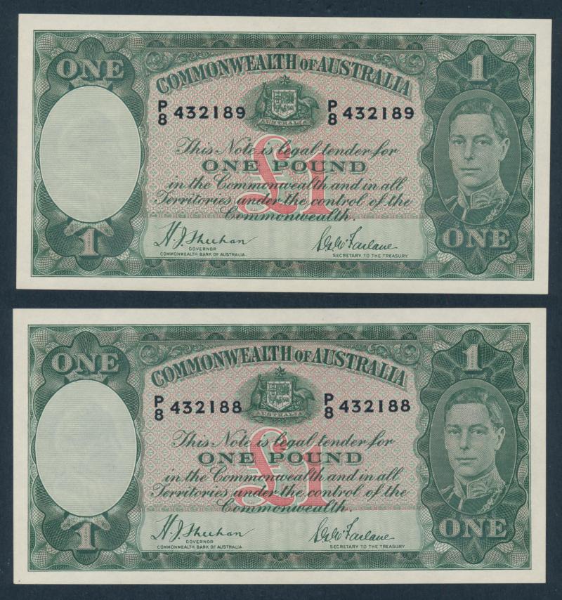 1938 KGVI £1 Sheehan/McFarlane R29 pair serials 'P/8 432188'-'189', both with centre pay-packet fold, aUnc, Cat $1100.