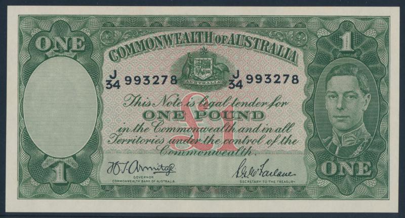1942 KGVI £1 Armitage/McFarlane Dark Green Main Print R30a serial 'J/34 99278', Uncirculated, Cat $425. (Image1) (Image2)
