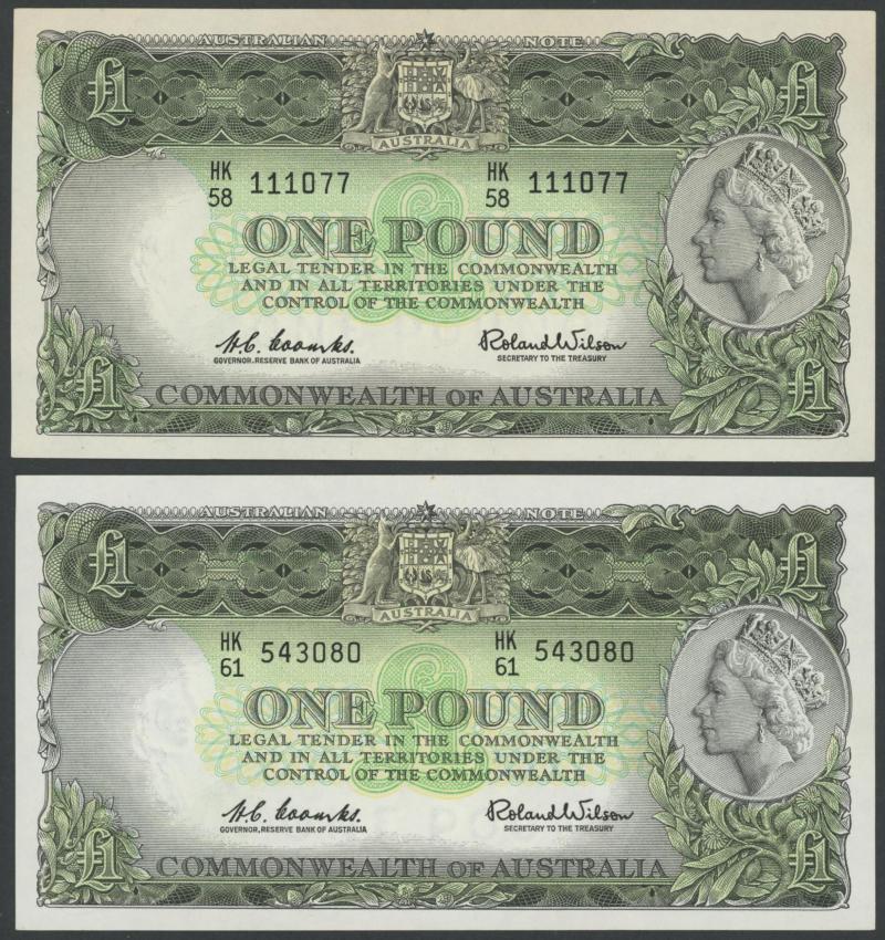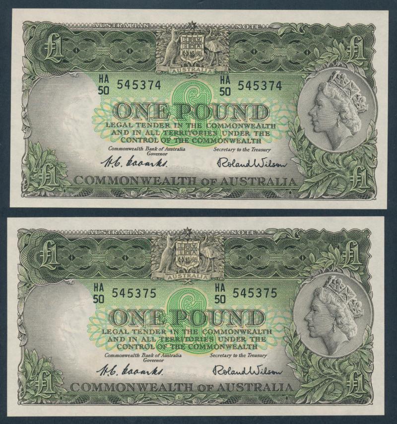 1953 QEII £1 Coombs/Wilson Commonwealth Bank R33 consecutive pair serials 'HA/50 545374'-'375', Unc, Cat $400.
