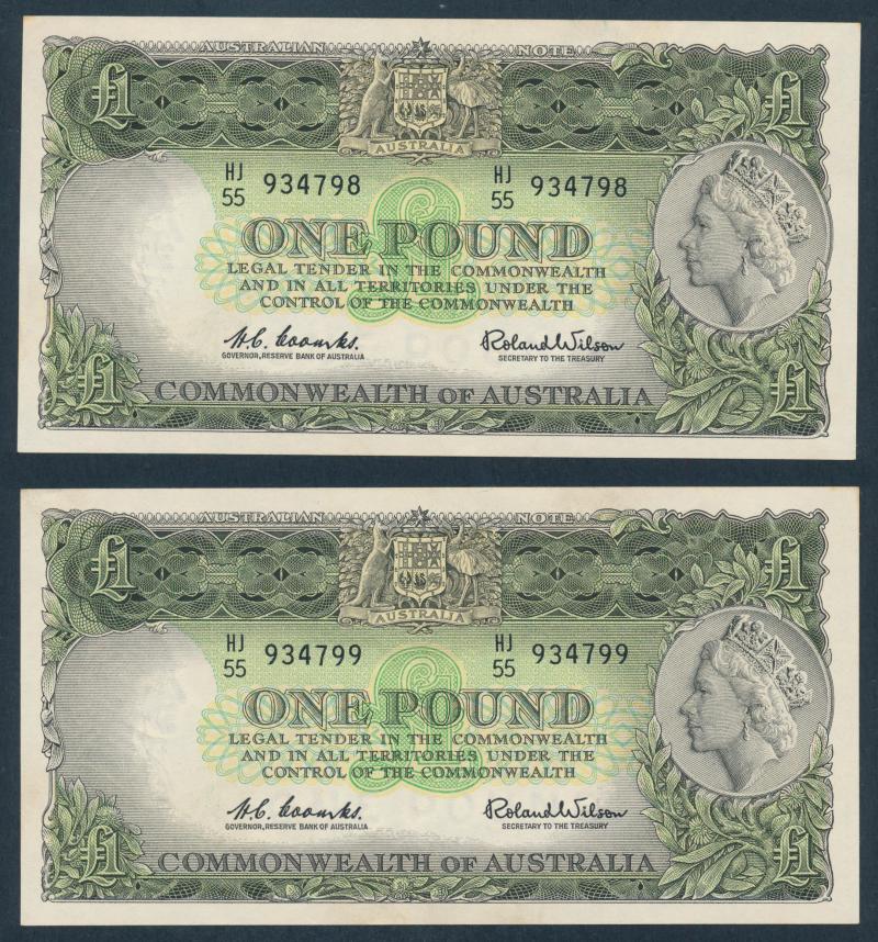 1961 QEII £1 Coombs/Wilson Reserve Bank R34a Dark Green Back consecutive pair serials 'HJ/55 934798'-'799', light overall ageing
