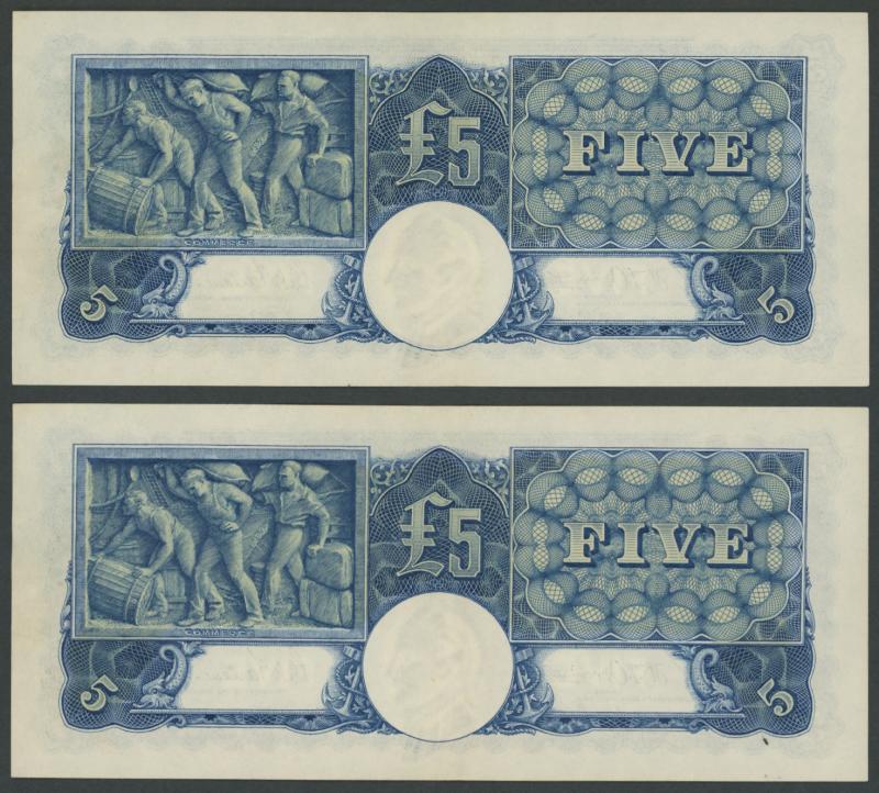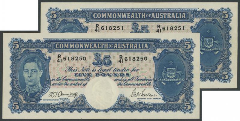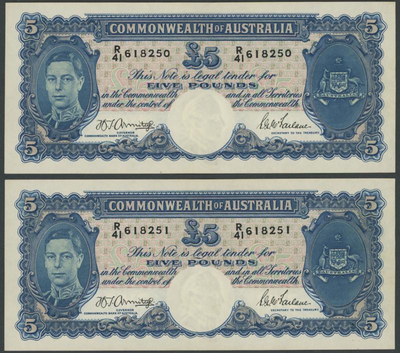 1941 KGVI £5 Armitage/McFarlane R46 consecutive pair serials 'R/41 618250'-'251', traces of pay-packet bend, wavy paper otherwise