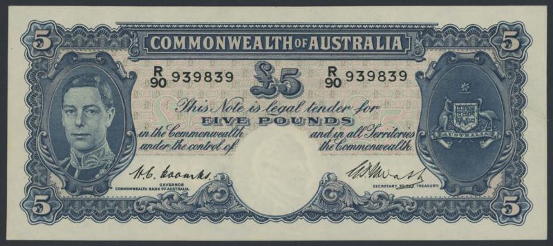 1949 KGVI £5 Coombs/Watt R47 serial 'R/90 939839', Uncirculated, Cat $1900. (Image1) (Image2)